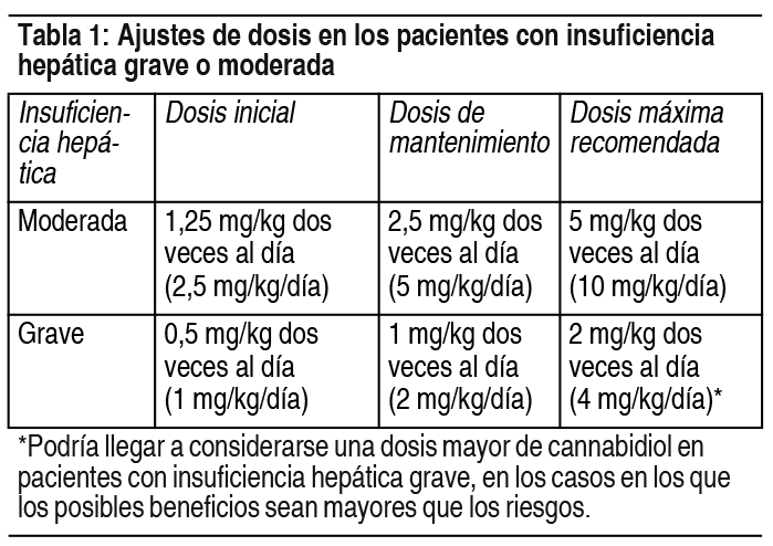 COMPOSICION: Cada ml de solución oral contiene: Cannabidiol 100.00 mg, Sabor Vainilla 0.46 mg, Aceite de Semilla de Sésamo c.s.p. 1.00 ml, Nitrógeno 1.1 mg. ACCION: Anticonvulsivante. INDICACIONES: Convupidiol está indicado como tratamiento complementario de convulsiones asociadas con el síndrome de Lennox- Gastaut (SLG) o el síndrome de Dravet (SD) en conjunto con clobazam, para pacientes desde los 2 años. DOSIS: El tratamiento con Convupidiol deberían iniciarlo y supervisarlo médicos con experiencia en el tratamiento de la epilepsia. La dosis inicial recomendada de cannabidiol es 2.5 mg/kg administrado 2 veces al día (5 mg/kg/día) durante 1 semana. Después de 1 semana, la dosis debe aumentarse a 1 dosis de mantenimiento de 5 mg/kg 2 veces al día (10 mg/kg/día). En función de la tolerabilidad y la respuesta clínica de cada persona, cada dosis puede aumentarse más en incrementos semanales de 2.5 mg/kg administrados 2 veces al día (5 mg/kg/día) hasta alcanzar una dosis recomendada máxima de 10 mg/kg 2 veces al día (20 mg/kg/día). Los aumentos de dosis superiores a los 10 mg/kg/día, hasta alcanzar la dosis máxima recomendada de 20 mg/kg/día, debe realizarse teniendo en cuenta el riesgo y el beneficio que plantea a cada persona y de acuerdo con el programa de supervisión completo. Cada estuche de Convupidiol incluye: Un dosificador bucal de 1 ml graduado en incrementos de 0.1 ml (cada incremento de 0.1 ml corresponde a 10 mg de cannabidiol). Un dosificador bucal de 5 ml graduado en incrementos de 0.25 ml (cada incremento de 0.25 ml corresponde a 25 mg de cannabidiol). Si la dosis calculada es de 100 mg (1 ml) o menos, debe usarse un dosificador bucal más pequeño de 1 ml. Si la dosis calculada es superior a 100 mg (1 ml), debe usarse un dosificador bucal más grande de 5 ml. La dosis calculada debe redondearse al incremento graduado más cercano. Discontinuación: Si el tratamiento con cannabidiol debe interrumpirse, la dosis se debe reducir de forma gradual. En los ensayos clínicos, la interrupción del tratamiento con cannabidiol se consiguió reduciendo la dosis en aproximadamente un 10 % al día durante 10 días. En función de las indicaciones médicas, puede requerirse realizar una disminución de la dosis más rápida o más lenta, a discreción del médico prescriptor. Dosis olvidadas: En caso de que se olvide administrar 1 o más dosis, las dosis olvidadas no deben compensarse. La administración de la dosis se deberá retomar en función del programa de tratamiento actual. En caso de que se olviden las dosis correspondientes a más de 7 días, deberá volver a ajustarse el tratamiento en función de la dosis terapéutica. Poblaciones especiales: Pacientes de edad avanzada (desde los 65 años): No se han establecido la seguridad y la eficacia de cannabidiol en pacientes con una edad igual o superior a los 65 años. En general, la selección de la dosis para un paciente de edad avanzada debe realizarse con cautela; normalmente se inicia con la dosis inferior indicada en la posología, ya que estos pacientes presentan una mayor frecuencia de disminución de la función cardíaca, renal o hepática, o de una enfermedad concomitante u otro tratamiento concurrente. Insuficiencia renal: Cannabidiol puede administrarse a pacientes con una insuficiencia renal leve, moderada o grave sin necesidad de ajustar la dosis. No se tienen datos en relación con pacientes con insuficiencia renal terminal. Se desconoce si cannabidiol es dializable. Insuficiencia hepática: Cannabidiol no requiere ajustes de dosis para pacientes con insuficiencia hepática leve (Child-Pugh A). Debe tenerse cautela con los pacientes que presenten una insuficiencia hepática grave (Child-Pugh C) o moderada (Child-Pugh B). Se recomienda emplear una dosis inicial inferior en los pacientes con insuficiencia hepática grave o moderada. El ajuste posológico debe realizarse de acuerdo con lo indicado en la tabla que aparece a continuación. Ver Tabla Población pediátrica: El uso de cannabidiol en niños con una edad inferior a los 6 meses no es apropiado. No se han establecido todavía la seguridad y la eficacia de cannabidiol en niños de 6 meses a 2 años. No se dispone de datos. Ajustes de dosis de otros medicamentos utilizados en combinación con cannabidiol: Un médico con experiencia en el tratamiento de pacientes a los que se administren medicamentos antiepilépticos concomitantes debería evaluar la necesidad de realizar ajustes de la dosis de cannabidiol o del/de los medicamento(s) concomitante(s) con el objetivo de gestionar las posibles interacciones de medicamentos. Forma de administración: Vía oral. Los alimentos pueden aumentar los niveles de cannabidiol y, por lo tanto, este medicamento debe administrarse de forma constante con o sin alimentos, incluida la dieta cetogénica. PRESENTACIONES: 1 frasco de vidrio (III) inactínico con tapa, con 35 ml de solución oral. 1 dosificador bucal de 1.0 ml, de uso oral, graduado desde 0 a 1.0 ml, con una precisión de 0.1 ml. 1 adaptador para el dosificador bucal de 1 ml y permitir perfecto ajuste al frasco. 1 dosificador bucal de 5.0 ml, de uso oral, graduado desde 0 a 5.0 ml, con una precisión de 0.25 ml. 1 adaptador para el dosificador bucal de 5 ml y permitir perfecto ajuste al frasco. |