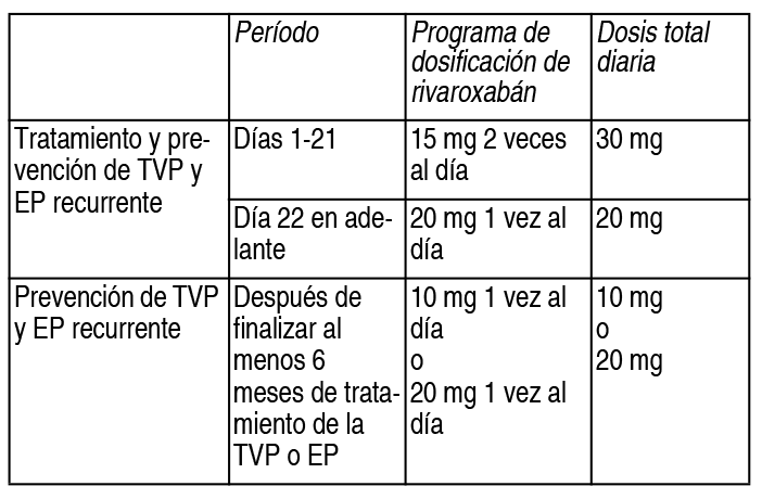COMPOSICION: Cada comprimido recubierto contiene: Rivaroxabán 10.00 mg. Excipientes: Laurilsulfato de Sodio 0.80 mg, Lactosa 23.60 mg, Hipromelosa 2.40 mg, Carboximetilcelulosa Reticulada 2.40 mg, Estearato de Magnesio 0.80 mg, Celulosa Microcristalina c.s.p. 80.00 mg, Alcohol Polivinílico 0.96 mg, Dióxido de Titanio 0.60 mg, Polietilenglicol 0.48 mg, Talco 0.36 mg, Rojo Óxido Férrico 0.15 mg. Este medicamento es libre de gluten. ACCION: Agente antitrombótico, inhibidor directo del factor Xa. Código ATC: B01AF01. INDICACIONES: Prevención del tromboembolismo venoso (TEV) en pacientes adultos sometidos a cirugía electiva de reemplazo de cadera o rodilla. Tratamiento de la trombosis venosa profunda (TVP), de la embolia pulmonar (EP), y prevención de las recurrencias de la TVP y de la EP en adultos. DOSIS: La dosis se adaptará según criterio médico al cuadro clínico del paciente. Como posología de orientación se recomienda: Prevención del TEV en adultos sometidos a cirugía electiva de reemplazo de cadera o rodilla: La dosis recomendada es de 1 comprimido recubierto de Drinax 10, tomado 1 vez al día. La dosis inicial debe tomarse entre 6 y 10 horas después de la intervención quirúrgica, siempre que se haya establecido la hemostasia. La duración del tratamiento depende del riesgo individual del paciente de presentar tromboembolismo venoso, que es determinado por el tipo de cirugía ortopédica. En los pacientes sometidos a cirugía mayor de cadera, se recomienda una duración de tratamiento de 5 semanas. En los pacientes sometidos a cirugía mayor de rodilla, se recomienda una duración de tratamiento de 2 semanas. Si se olvida una dosis, el paciente debe tomar Drinax 10 inmediatamente y seguir al día siguiente con la toma 1 vez al día, como antes. Tratamiento de la TVP, tratamiento de la EP y prevención de las recurrencias de la TVP y de la EP: La dosis recomendada para el tratamiento inicial de la TVP aguda o de la EP es de 1 y 1/2 comprimido recubierto de Drinax 10 (15 mg de rivaroxabán) 2 veces al día, durante las 3 primeras semanas, seguida de 2 comprimidos recubiertos de Drinax 10 (20 mg de rivaroxabán) 1 vez al día para el tratamiento continuado, así como para la prevención de las recurrencias de la TVP y de la EP. Se debe considerar una duración corta del tratamiento (por lo menos 3 meses) en los pacientes con TVP o EP provocada por factores mayores de riesgo transitorio (es decir, cirugía mayor o traumatismo recientes). Se debe considerar una duración más prolongada del tratamiento en los pacientes con TVP o EP provocada, no relacionada con factores mayores de riesgo transitorio, TVP o EP no provocada o antecedentes de TVP o EP recurrente. Cuando está indicada la prevención extendida de la TVP o EP recurrente (después de finalizar por lo menos 6 meses de tratamiento de la TVP o la EP), la dosis recomendada es de 10 mg 1 vez al día. Se debe considerar la administración de una dosis de 20 mg de rivaroxabán 1 vez al día en los pacientes en los que se considera que el riesgo de TVP o EP recurrente es alto, por ejemplo, los que tienen comorbilidades complicadas o los que han presentado TVP o EP recurrente con la prevención extendida con 10 mg de rivaroxabán 1 vez al día. La duración del tratamiento y la selección de la dosis deben individualizarse después de una valoración cuidadosa del beneficio del tratamiento frente al riesgo de hemorragia (ver Advertencias y precauciones). Ver Tabla Si el paciente olvida una dosis durante la fase de tratamiento de 15 mg 2 veces al día (días 1 a 21), este deberá tomar inmediatamente 3 comprimidos recubiertos de Drinax 10 para garantizar una toma de 30 mg de rivaroxabán al día y al día siguiente se deberá seguir con la pauta habitual recomendada de 15 mg 2 veces al día. Si el paciente olvida una dosis durante la fase de tratamiento de 1 vez al día, deberá tomar inmediatamente Drinax 10 y seguir al día siguiente con la pauta recomendada de 1 vez al día. La dosis no debe duplicarse en el mismo día para compensar una dosis olvidada. Cambio de tratamiento con antagonistas de la vitamina K (AVK) a Drinax 10: En el caso de pacientes tratados por TVP, EP y en la prevención de sus recurrencias, deberá interrumpirse el tratamiento con AVK e iniciarse el tratamiento con Drinax 10 cuando el valor del RIN sea ≤ 2.5. Al cambiar el tratamiento con AVK a Drinax 10, los valores de RIN del paciente estarán falsamente elevados después de la toma de Drinax 10. El RIN no es un parámetro válido para medir la actividad anticoagulante de Drinax 10, por lo que no debe utilizarse. Cambio de tratamiento con Drinax 10 a antagonistas de la vitamina K (AVK): Existe la posibilidad de una incorrecta anticoagulación durante la transición de Drinax 10 a AVK. Deberá garantizarse una anticoagulación adecuada y continua durante cualquier transición a un anticoagulante alternativo. Debe señalarse que Drinax 10 puede contribuir a un aumento del RIN. En los pacientes que cambien de Drinax 10 a AVK, estos tratamientos deben administrarse simultáneamente hasta que el RIN sea ≥ 2.0. Durante los 2 primeros días del período de cambio, se utilizará la dosis inicial estándar de AVK, que se ajustará posteriormente en función de los resultados del RIN. Mientras los pacientes están bajo tratamiento con Drinax 10 y AVK, el RIN puede determinarse a partir de las 24 horas que siguen a la dosis de Drinax 10 y siempre antes de la siguiente dosis. Una vez interrumpido el tratamiento con Drinax 10, el RIN puede determinarse con fiabilidad pasadas 24 horas de la última dosis. Cambio de tratamiento con anticoagulante parenteral a Drinax 10: Los pacientes que están recibiendo un anticoagulante por vía parenteral deben interrumpir el tratamiento anticoagulante por vía parenteral e iniciar el tratamiento con Drinax 10 de 0 a 2 horas antes de la siguiente administración programada del medicamento por vía parenteral (por eje