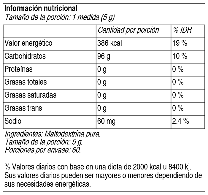 COMPOSICION: Contiene: Maltodextrina 100 %. Ver Tabla ACCION: Suplemento dietario a base de maltodextrina pura sin sabor sin gluten. MaltoD+® es un módulo nutricional a base de hidratos de carbono de rápida absorción, diseñado para aportar energía en forma eficiente. La maltodextrina se obtiene a partir de la hidrólisis controlada del almidón, lo que genera polímeros de glucosa de baja osmolaridad, fáciles de digerir y con buena tolerancia gastrointestinal. INDICACIONES: MaltoD+® tiene como función principal cubrir requerimientos energéticos en pacientes que necesitan aumentar la ingesta calórica a base de hidratos de carbono sin modificar significativamente el volumen, la textura ni el sabor de las preparaciones. Puede incorporarse a bebidas o comidas, dulces o saladas, pues por su bajo poder edulcorante prácticamente no modifica su sabor. El índice glucémico es alto (G5). MaltoD+® La medida adjunta contiene al ras 5 g de producto. La ingesta diaria de MaltoD+® debe ser recomendada por un médico o licenciada en nutrición con conocimientos en soporte nutricional. DOSIS: Modo de empleo y preparación: Lavarse las manos, asegurarse de que el envase esté limpio, utilizar utensilios limpios y/o esterilizados para la preparación. Agregar las medidas indicadas por tu profesional médico o nutricionista especialista en soporte nutricional. Una vez preparado el producto, consumirlo dentro de las 2 horas. Desechar el sobrante. ADVERTENCIAS: El producto debe ser administrado bajo supervisión médica y nutricional. No administrar por vía parenteral. Utilizar solo por vía oral/enteral. No administrar en niños menores de 1 año. No utilizar en lactantes. CONSERVACION: Mantener el envase en lugar fresco y seco. No debe refrigerarse ni someterse a calor excesivo. Una vez abierto el envase, mantenerlo cerrado y consumirlo en un plazo no mayor de 1 mes. PRESENTACIONES: Envase conteniendo 300 g de polvo. |