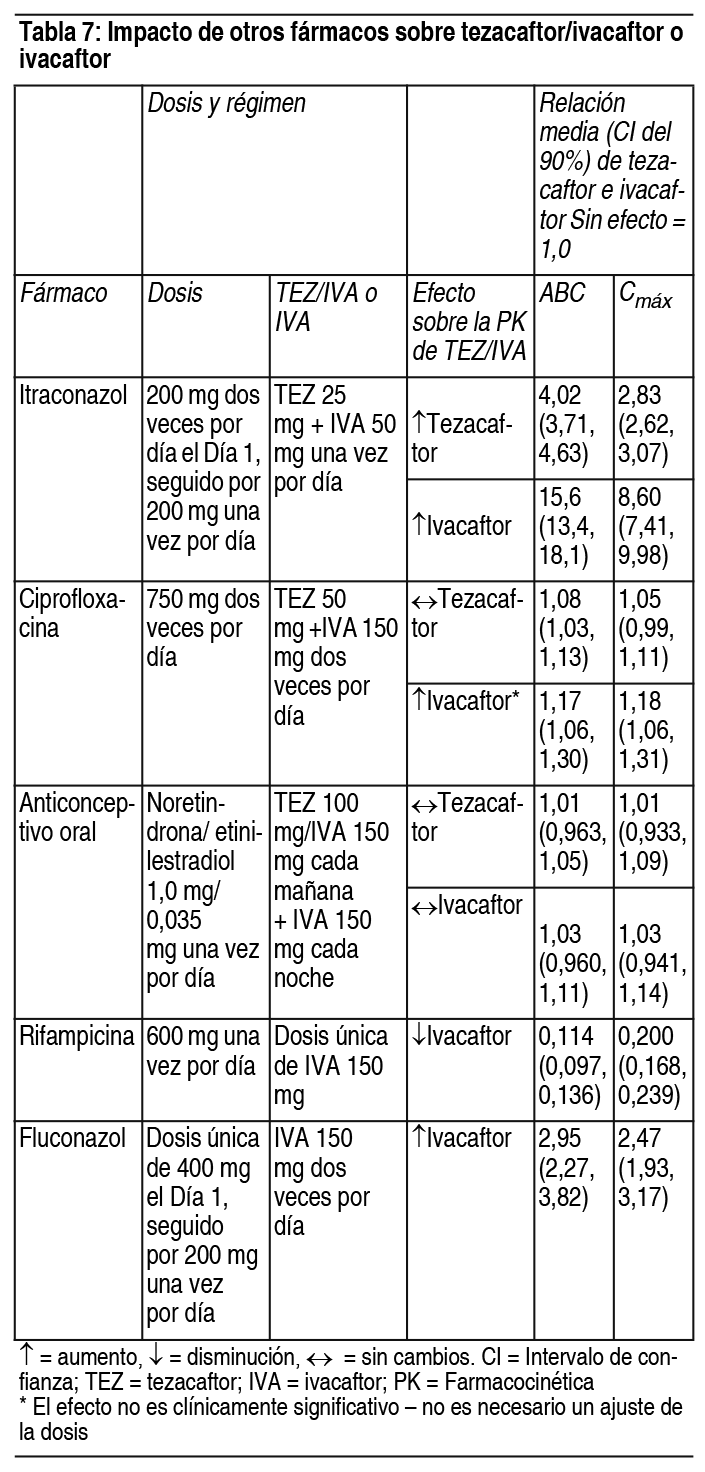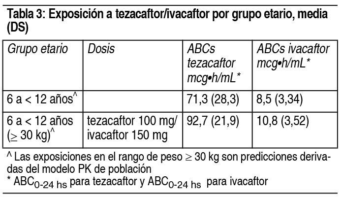 COMPOSICION: Cada comprimido recubierto amarillo de contiene: Ivacaftor 150 mg; Tezacaftor 100 mg. Excipientes: Lauril Sulfato de Sodio, Hidroxipropilmetilcelulosa Acetato Succinato, Hidroxipropilmetilcelulosa E15, Croscaramelosa Sódica, Silica Coloidal Anhidra, Celulosa Microcristalina PH 102, Estearato de Magnesio Vegetal, Aquarius Prime BAT 218006 1), Óxido de Hierro Amarillo, Opadry FX Silver 62W28547 2) c.s. 1) Compuesto por: Dióxido de Titanio, Triacetina, Hidroxipropilmetilcelulosa. 2) Compuesto por: Pigmento Perlado con Base de Mica, Maltodextrina, Carboximetilcelulosa Sódica, Lecitina, Dextrosa Monohidrato. Cada comprimido recubierto celeste contiene: Ivacaftor 150 mg. Excipientes: Laurilsufato de Sodio, Hidroxipropilmetilcelulosa Acetato Succinato, Croscaramelosa Sódica, Celulosa Microcristalina PH101, Polivinilpirrolidona Celulosa Microcristalina PH102, Estearato de Magnesio Vegetal, Opadry II 85F28751 White 1), Indigotina Laca Alumínica, Opadry FX Silver 62W28547 2) c.s. 1) Compuesto por: Alcohol Polivinílico, Dióxido de Titanio, Polietilenglicol, Talco. 2) Compuesto por: Carboximetilcelulosa Sódica, Maltodextrina, Dextrosa Monohidrato, Pigmento Perlado con Base de Mica, Lecitina. ACCION: Modulador de CFTR (regulador de la conductancia transmembrana de la fibrosis quística). Código ATC: R07AX31. INDICACIONES: Tezacar® es una combinación de tezacaftor e ivacaftor, indicado para el tratamiento de pacientes con fibrosis quística (FQ) a partir de los de 6 años de edad y con un peso mayor o igual a 30 kg que son homocigotas para la mutación F508 de lo que presentan al menos una mutación en el gen regulador de la conductancia transmembrana de la fibrosis quística (CFTR) que presenta respuesta al tratamiento con tezacaftor/ivacaftor en base a los datos in vitroy/o la evidencia clínica (ver Propiedades farmacológicas). En caso de desconocerse el genotipo de un paciente, debe efectuarse un análisis de mutaciones del gen de la FQ para detectar la presencia de una mutación en el CFTR y, posteriormente, debe verificarse el esultado con una secuenciación bidireccional según lo recomienden las instrucciones de uso correspondientes al análisis de mutaciones. DOSIS: Información de dosificación en adultos, adolescentes y niños a partir de los de 6 años de edad y con un peso ≥ 30 kg: La dosis recomendada es 1 comprimido (tezacaftor 100 mg/ivacaftor 150 mg) tomado por la mañana y 1 comprimido (ivacaftor 150 mg) tomado por la noche, separados por aproximadamente 12 horas. Tezacar® es para uso oral. Dosis omitidas: Si pasaron 6 horas o menos desde la dosis de la mañana o de la noche que se olvidó tomar, el paciente debe tomar la dosis olvidada tan pronto como sea posible y continuar con el régimen original. Si pasaron más de 6 horas desde la dosis olvidada de la mañana o de la noche, el paciente no debe tomar la dosis olvidada. La siguiente dosis del régimen puede tomarse al horario usual. No debe tomarse más de 1 dosis al mismo tiempo. Posología en poblaciones especiales: Ajuste de la dosis para los pacientes con insuficiencia hepática: Para el ajuste de la dosis para pacientes con insuficiencia hepática,consulte la Tabla 4. No se han realizado estudios en pacientes con insuficiencia hepática severa (Child-Pugh Clase C), pero se espera que la exposición de tezacaftor e ivacaftor sea mayor que en los pacientes con insuficiencia hepática moderada. Por lo tanto, Tezacar® debe usarse con precaución con una dosis ajustada después de evaluar los riesgos y beneficios del tratamiento en estos pacientes (ver Posología y administración, Uso en poblaciones especiales, Propiedades farmacológicas). Ver Tabla Ajuste de la dosis para pacientes que toman fármacos que son inhibidores de la CYP3A: El régimen de dosificación de Tezacar® debería ser ajustado cuando es coadministrado con inhibidores moderados y potentes de la CYP3A. Cuando se coadministra con inhibidores moderados de la CYP3A (por ejemplo, fluconazol, eritromicina), el régimen de dosificación debería ser ajustado como se indica en la Tabla 5 (ver Interacciones con otros Fármacos, Propiedades farmacológicas). Cuando se coadministra con inhibidores potentes de la CYP3A (por ejemplo, ketoconazol, itraconazol, posaconazol, voriconazol, telitromicina y claritromicina), el régimen de dosificación debería ser ajustado como en la Tabla 5 (ver Interacciones con otros fármacos, Propiedades farmacológicas). Ver Tabla Ver Tabla Deberían evitarse alimentos o bebidas que contengan pomelo o naranjas amargas durante el tratamiento con Tezacar® (ver Inteacciones con otros fármacos). Modo de administración: Tezacar® es para uso oral. Indicar a los pacientes que traguen los comprimidos enteros. Tezacar® debería tomarse con alimentos con contenido graso, tales como los alimentos recomendados en las guías nutricionales estándar para la enfermedad. Ejemplos de alimentos que contienen grasa son aquellos preparados con manteca o aceites o aquellos que contienen huevos, quesos, nueces, leche entera, o carnes. CONTRAINDICACIONES: Hipersensibilidad a algunos de los principios activos o algunos de los excipientes. ADVERTENCIAS: Advertencias y precauciones especiales de empleo: Elevaciones de las transaminasas (AST/ALT): Se han observado aumento de transaminasas en pacientes con FQ tratados con tezacaftor/ivacaftor, así como también con monoterapia con ivacaftor. Se recomienda realizar evaluaciones de las transaminasas (ALT y AST) en todos los pacientes antes de comenzar con la administración de Tezacar®, cada 3 meses durante el primer año de tratamiento y luego anualmente. Para los pacientes con antecedentes de elevaciones de las transaminasas debería considerarse un monitoreo más frecuente. En el caso de elevaciones significativas de las transaminasas, por ejemplo, pacientes con valores de ALT o AST >5 del límite superior del rango normal (LSN),o valores de ALT o AST >3 del LSN con valores de 