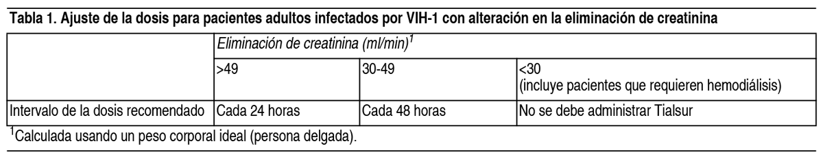 COMPOSICION: Cada comprimido de Tialsur contiene: Emtricitabina 200 mg, Tenofovir Disoproxil Fumarato 300 mg (equivalentes a 245 mg de tenofovir disoproxil). Excipientes c.s. ACCION: Antirretrovirales pertenecientes al grupo de inhibidores nucleosídicos y nucleotídicos de la retrotranscriptasa (INTR) que se utilizan para tratar la infección por VIH-1. Código ATC: J05AR03. INDICACIONES: Tratamiento de la infección VIH-1 en adultos y pacientes pediátricos que pesen al menos 35 kg: Tialsur, en combinación con otros agentes antirretrovirales (tales como inhibidores no nucleósidos de la transcriptasa reversa o inhibidores de la proteasa), está indicado para el tratamiento de la infección VIH-1 en adultos y pacientes pediátricos que pesen al menos 35 kg. Profilaxis preexposición (PrEP) en adultos de alto riesgo: Tialsur, en combinación con prácticas de sexo seguro, está indicado en la profilaxis preexposición (PrEP) para reducir el riesgo de adquirir VIH-1 sexualmente en adultos. Si se considera Tialsur para la profilaxis preexposición, los siguientes factores colaboran para identificar a las personas de alto riesgo: Pareja sexual que se conoce infectada con VIH-1. Participar en actividades sexuales dentro de sitios o de redes sociales de alta prevalencia de infección por VIH-1 como: Uso inconsistente o no uso de preservativos. Diagnóstico de enfermedades de transmisión sexual. Intercambio de sexo por dinero, comida, vivienda o drogas ilícitas. Uso de drogas ilícitas y/o uso de alcohol en condiciones de abuso y dependencia. Población carcelaria privada de su libertad. Pareja con cualquiera de los factores listados arriba de la que se desconoce el estatus con respecto al VIH-1. Al prescribir Tialsur en profilaxis preexposición, los profesionales de la salud deben: Indicar Tialsur dentro de una estrategia global preventiva, teniendo en cuenta que Tialsur no es siempre efectivo en prevenir la infección por VIH-1. Aconsejar a todos los pacientes no infectados adherir estrictamente a la posología de Tialsur recomendada, ya que la efectividad en reducir el riesgo de la infección por VIH-1 está estrictamente correlacionada con la adherencia, como se demostró por el monitoreo terapéutico de drogas en los ensayos clínicos. Confirmar seronegatividad con un test de VIH-1 inmediatamente antes de iniciar Tialsur en la indicación de profilaxis preexposición. Si se presentan síntomas clínicos consistentes con infección viral aguda y/o se sospecha exposición reciente (menos de 1 mes), se debe demorar el inicio de la profilaxis preexposición por lo menos 1 mes y reconfirmar el estatus acerca del VIH-1 o utilizar un test aprobado para confirmar el diagnóstico de infección por VIH-1 incluyendo a la infección aguda o primaria. Realizar un test para detectar infección por VIH-1 al menos 1 vez cada 3 meses cuando se esté bajo tratamiento con Tialsur en la indicación de profilaxis preexposición. DOSIS: La posología habitual es de 1 comprimido diario de Tialsur, sin embargo, puede haber situaciones especiales. A continuación, se describe el esquema posológico sugerido para cada indicación: Tratamiento de la infección por VIH-1 en adultos y pacientes pediátricos que pesan más de 35 kg: En adultos y pacientes pediátricos con peso corporal mayor o igual a 35 kg: 1 comprimido recubierto de Tialsur por día, por vía oral, con o sin alimentos. Ajuste de dosis para insuficiencia renal: En pacientes con insuficiencia renal moderada a severa cuando se administró tenofovir o emtricitabina se produjo un aumento significativo de las concentraciones de estas drogas. Por lo tanto, el intervalo de dosis de Tialsur debe ajustarse en pacientes con una línea de base de depuración de creatinina de 30-49 ml/min, en quienes debe espaciarse el intervalo interdosis a 48 horas, y en quienes tengan < 30 ml/min de clearance no deberían utilizar Tialsur (Tabla 1). En pacientes con insuficiencia renal leve (clearence de creatinina entre 50 y 80 ml/min) no es necesario un ajuste de dosis. La seguridad y la eficacia de estas recomendaciones concernientes al ajuste del intervalo de la dosis no se han evaluado a nivel clínico en pacientes con VIH-1 e insuficiencia renal moderada, por consiguiente, la respuesta clínica al tratamiento y la función renal deben ser controladas rigurosamente en estos pacientes, en los que se sugiere monitoreos frecuentes de depuración de creatinina, fósforo sérico, glucosuria, proteinuria. No existen datos suficientes para hacer recomendaciones de ajustes de dosis en pacientes pediátricos con compromiso de la función renal. Ver Tabla Profilaxis preexposición (PrEP): En adultos de alto riesgo no infectados por VIH-1: 1 comprimido recubierto de Tialsur por día, con o sin alimentos. No debe utilizarse Tialsur en pacientes no infectados por VIH-1 con indicación de profilaxis preexposición cuya depuración de creatinina sea menor a 60 ml/min. Si se observa una disminución en el aclaramiento de creatinina estimado en individuos no infectados mientras usa Tialsur para la PrEP del VIH-1, evalúe las causas potenciales y vuelva a evaluar los riesgos y beneficios potenciales del uso continuo. PRESENTACIONES: Envases conteniendo 30 comprimidos. |