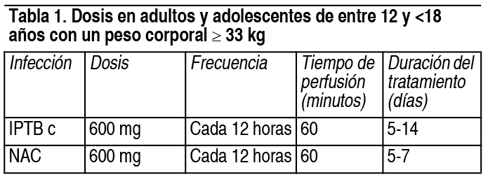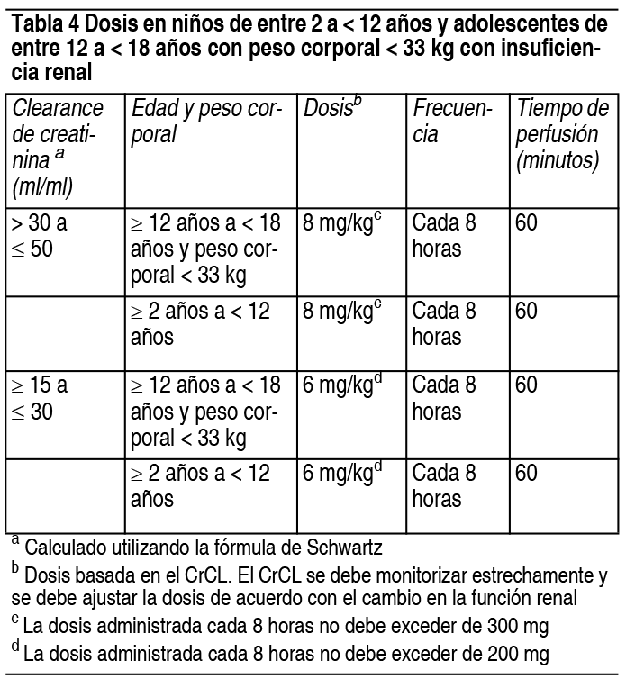COMPOSICION: Cada frasco-ampolla contiene: Ceftarolina Fosamil 600 mg. Excipientes: L-arginina. ACCION: Código ATC: JO1DI02. Antibacterianos para uso sistémico, otras cefalosporinas. INDICACIONES: Zinforo está indicado para el tratamiento de las siguientes infecciones en adultos y niños a partir de 2 meses de edad: Infecciones complicadas de la piel y los tejidos blandos (IPTBc). Neumonía adquirida en la comunidad (NAC). Se deben tener en consideración las recomendaciones oficiales sobre el uso adecuado de agentes antibacterianos. DOSIS: Adultos y adolescentes de 12 a < 18 años con peso corporal ≥33 kg: ver Tabla 1. Ver Tabla Ver Tabla Poblaciones especiales: Pacientes de edad avanzada: No se requiere ajuste de dosis en pacientes de edad avanzada con valores de clearance de creatinina > 50 ml/min. Insuficiencia renal: La dosis debe ser ajustada cuando el clearance de creatinina (CrCL) sea ≤50 ml/min, tal como se muestra a continuación. Las recomendaciones de dosis para niños y adolescentes están basadas en modelos farmacocinéticos. No hay información suficiente para recomendar ajustes de dosis en adolescentes de entre 12 a <18 años con peso corporal < 33 kg y en niños de entre 2 y 12 años con ESRD. No hay suficiente información para recomendar ajustes de dosis en niños de 2 meses a < 2 años con insuficiencia renal moderada o grave o ESRD. Ver Tabla Ver Tabla Insuficiencia hepática: No se considera necesario el ajuste de dosis en pacientes con insuficiencia hepática. Población pediátrica: No se ha establecido todavía la seguridad y eficacia de Zinforo en niños menores de 2 meses de edad. Modo de administración: Zinforo se administra mediante infusión endovenosa durante 60 minutos para todos los volúmenes de infusión (50 ml, 100 ml o 250 ml) (ver Precauciones especiales de eliminación y otras manipulaciones). Los volúmenes de infusión para pacientes pediátricos variarán de acuerdo al peso del niño. La concentración de la solución para infusión durante la preparación y administración no debe exceder de 12 mg/ml de ceftarolina fosamil. Precauciones especiales de eliminación y otras manipulaciones: El polvo debe reconstituirse con agua para preparaciones inyectables y el concentrado resultante debe entonces diluirse inmediatamente antes de su uso. La solución reconstituida es una solución de color amarillo pálido que está libre de partículas. Para la preparación y administración de la solución se deben emplear técnicas asépticas estándares. El polvo de Zinforo debe reconstituirse con 20 ml de agua para preparaciones inyectables. La solución resultante debe ser agitada antes de ser transferida a una bolsa o botella para infusión que contenga cloruro sódico 9 mg/ml (0.9%) solución para inyección, dextrosa 50 mg/ml (5%) solución para inyección, cloruro sódico 4.5 mg/ml y dextrosa 25 mg/ml solución para inyección (0.45% cloruro sódico y 2.5% dextrosa) o solución lactato de Ringer. Se puede utilizar una bolsa para infusión de 250 ml, 100 ml o 50 ml para preparar la infusión, basándose en el volumen requerido del paciente. El intervalo de tiempo total entre el comienzo de la reconstitución y la finalización de la preparación de la infusión endovenosa no debe exceder los 30 minutos. Los volúmenes de infusión para pacientes pediátricos variarán de acuerdo con el peso del niño. La concentración de la solución para infusión durante la preparación y administración no debe exceder de 12 mg/ml de ceftarolina fosamil. Cada frasco-ampolla es sólo para un único uso. La eliminación del medicamento no utilizado y de todos los materiales que hayan estado en contacto con él, se realizará de acuerdo con la normativa local. Período de validez: Tras la reconstitución: El vial reconstituido debe utilizarse inmediatamente. Tras la dilución: Una vez que se ha preparado la solución intravenosa con diluyentes incluidos en Precauciones especiales de eliminación y otras manipulaciones debe administrarse dentro de las 6 horas siguientes a su preparación. Se ha demostrado la estabilidad química y física en uso durante un período de hasta 24 horas a 2-8º C. Una vez retirado de la refrigeración a temperatura ambiente, el producto diluido debe utilizarse en un plazo de 6 horas. Desde un punto de vista microbiológico, el medicamento debe utilizarse inmediatamente. Si no se utiliza inmediatamente, los tiempos de conservación en uso y condiciones antes de usar son responsabilidad del usuario y normalmente no deberían ser más de 24 horas a una temperatura entre 2 a 8º C, a menos que la reconstitución/dilución haya tenido lugar en condiciones asépticas controladas y validadas. PRESENTACIONES: Envase conteniendo 10 frascos-ampolla. |