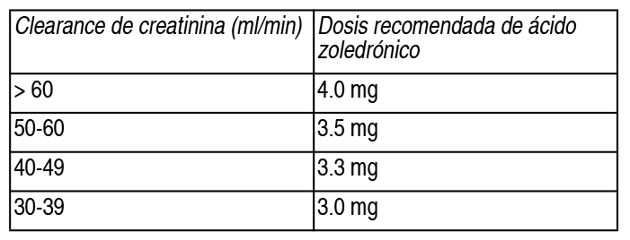 COMPOSICION: Ácido Zoledrónico Liofilizado: Cada frasco ampolla contiene: Ácido Zoledrónico Monohidratado (equivalente a 4 mg de ácido zoledrónico anhidro) 4.264 mg, Manitol 220.000 mg, Citrato de Sodio 24.000 mg. Cada frasco ampolla de disolvente contiene: Agua para Inyectables 5.0 ml. ACCION: Inhibidor de la resorción osteoclástica. Clasificación ATC: M05BA 08. INDICACIONES: Regulador del metabolismo óseo. Tratamiento de metástasis óseas osteolíticas y mixtas de tumores sólidos y lesiones osteolíticas de mieloma múltiple, junto con una terapia antineoplásica convencional. Tratamiento de la hipercalcemia de neoplasia maligna (HNM). DOSIS: Zolenova solo debe ser administrado por un profesional de la salud con experiencia en la administración intravenosa de bifosfonatos. Tratamiento de metástasis óseas y tratamiento de lesiones osteolíticas junto con una terapia antineoplásica convencional: Adultos y personas da edad avanzada: La dosis en el tratamiento de las metástasis óseas y de las lesiones osteolíticas es de 4 mg de ácido zoledrónico en una solución reconstituida y posteriormente diluida (con 100 ml de una solución de cloruro de sodio al 0.9 % o una solución de dextrosa al 5 %), administrada en infusión intravenosa de 15 minutos cada 3-4 semanas. Adicionalmente, los pacientes deberían recibir en forma oral 500 mg de un suplemento de calcio y 400 UI de vitamina D diarios. La decisión de tratar a los pacientes con metástasis óseas para la prevención de eventos relacionados con el esqueleto debe considerar que el inicio del efecto del tratamiento es de 2-3 meses. Tratamiento de la HNM: En adultos y personas de edad avanzada, la dosis recomendada en hipercalcemia inducida por tumores (concentración de calcio sérico corregida respecto a la albúmina 3 > 12 mg/dl o 3 mmol/l) es de 4 mg administrada en 1 única dosis por vía intravenosa en no menos de 15 minutos. Los pacientes deben ser adecuadamente hidratados antes de la administración. Los pacientes que muestran una respuesta completa (normalización del calcio sérico 2.7 mmol/l) y recaen o que son refractarios al tratamiento inicial pueden volver a ser tratados con 8 mg de ácido zoledrónico, administrado en 1 infusión única intravenosa de 15 minutos. Sin embargo, se esperará por lo menos 1 semana antes de la repetición del tratamiento por si se produce una respuesta completa a la dosis inicial. Insuficiencia renal: En pacientes con función renal reducida e insuficiencia renal grave, se considerará el tratamiento con ácido zoledrónico solo después de evaluar los riesgos y beneficios de este. En ensayos clínicos se excluyeron a los pacientes con valores de creatinina sérica > 400 μmol/l o > 4.5 mg/dl. No es necesario ajustar la dosis en pacientes con HNM si los valores de creatinina sérica son < 400 μ/l o < 4.5 mg/dl. Prevención de eventos esqueléticos relacionados en pacientes con neoplasias avanzadas que involucran al hueso: Cuando se instaura un tratamiento con ácido zoledrónico en pacientes con mieloma múltiple o lesiones óseas metastásicas de tumores sólidos, se deben determinar las concentraciones de creatinina sérica y la depuración (clearance) de creatinina. Los pacientes con insuficiencia renal grave con una depuración de creatinina inferior a 30 ml/min no deberían recibir ácido zoledrónico. Los pacientes con creatinina sérica ≥ 265 μmol/l pμ 3 mg/dl fueron excluidos de estudios clínicos realizados. Para los pacientes con metástasis ósea con insuficiencia renal leve o moderada (depuración de creatinina entre 30-60 ml/min previo a iniciar la terapia) se recomiendan las siguientes dosis: Ver Tabla Durante el tratamiento la concentración de creatinina sérica debe evaluarse antes de cada dosis de ácido zoledrónico y al tratamiento debe ser ajustado para evitar el fallo renal. Además, se recomienda administrar un suplemento de 500 mg de calcio y 400 UI de vitamina D diaria, por vía oral. Liofilizado: Preparación de la solución: Cada vial de ácido zoledrónico se reconstituye con 5.0 ml de agua estéril para inyección, en forma aséptica, agitar hasta la disolución total. Para preparar una solución para infusión que contenga 8 mg de ácido zoledrónico, se reconstituye bajo condiciones asépticas 2 frascos de 4 mg añadiendo a cada uno 5 ml de agua estéril para inyección como se ha descripto para el caso anterior. Diluir en ambos casos la solución resultante con 100 ml de solución de cloruro de sodio al 0.9 % p/v o solución de glucosa al 5 % p/v. No mezclar la solución reconstituida de ácido zoledrónico con soluciones que contengan calcio, como la solución Ringer. La solución preparada con ácido zoledrónico deberá ser utilizada preferentemente de inmediato, en caso contrario la conservación antes de su utilización es responsabilidad del profesional y deberá conservarse en heladera entre 2 y 8 ºC, dejar que la solución refrigerada alcance la temperatura ambiente antes de ser administrada. El tiempo transcurrido entre la reconstitución, dilución y la administración no debe exceder las 24 horas en total. Los estudios realizados con frascos de vidrio y con diferentes tipos de bolsa (prellenadas con cloruro de sodio al 0.9 % p/v o solución de glucosa al 5 %) de infusión y guías de infusión de cloruro de polivinilo, polietileno y polipropileno no revelaron incompatibilidad alguna con el ácido zoledrónico. Dado que no se dispone de datos sobre la compatibilidad del ácido zoledrónico con otras sustancias administradas por vía intravenosa, no debe mezclarse con otros medicamentos/sustancias y debe administrarse siempre por una guía de infusión separada. Debido al riesgo significativo de deterioro de la función renal, la dosis única de ácido zoledrónico no debe exceder los 4 mg y debe administrarse como una única infusión intravenosa en no menos de 15 minutos. Nota: Las soluciones para uso parenteral deben ser inspec