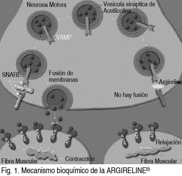 Descripción: Uno de los rasgos más característicos del envejecimiento de la piel es el incremento de las arrugas en la cara. Este es un fenómeno natural producido por el paso del tiempo y se identifica por los cambios bioquímicos, histológicos y fisiológicos que son acentuados por la exposición medioambiental de la piel. Existen también otros factores secundarios que provocan la aparición de arrugas en la cara, como son la fuerza de gravedad, la repetición constante de los movimientos debido a las contracciones de los músculos de expresión facial y la presión constante sobre la piel facial debido a la posición (por ej., al dormir). Independientemente del origen fisiológico de la arruga, el mecanismo molecular involucrado en el envejecimiento de la piel está directamente relacionado con los cambios de conformación de la triple hélice de colágeno, la degradación de polipéptidos de la elastina y el desorden en el empaquetamiento de la matriz lipídica de la piel. Por otro lado, se han establecido en publicaciones recientes que estos cambios conformacionales y distorsiones del empaquetado de la matriz lipídica pueden ser significativamente evitados mediante la modulación de la contracción muscular. Los músculos se contraen al recibir neurotransmisores liberados por vesículas. El complejo SNARE (SNAp Receptor) es esencial para esta liberación de neurotransmisor en la sinapsis (A.Ferrer Montiel et al, The Journal of Biological Chemestry, 1997, 272, 2634-2638). Es un complejo ternario formado por las proteínas VAMP, sintaxina y SNAP-25 (SyNaptosomal associated Protein). Este complejo se comporta como un gancho celular que captura las vesículas portadoras y las fusiona con la membrana celular permitiendo la liberación de neurotransmisores. Argireline es un análogo del extremo N terminal de la proteína SNAP-25 y por ello compite con ésta por una posición en el complejo SNARE, modulando su formación. Cuando el complejo SNARE es desestabilizado ligeramente, las vesículas no pueden anclarse y liberar neurotransmisores de manera eficiente, y por tanto, la contracción muscular se ve atenuada, previniendo la formación de arrugas.
