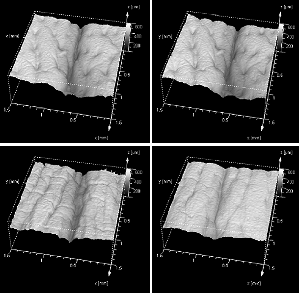 Fig. 3. Imágenes de topografía de la piel antes (izquierda) y después de un tratamiento de 30 días con una crema conteniendo Argireline® (derecha). Las imágenes de arriba muestran una crema placebo utilizada como control. Las inferiores muestran una crema con la misma formulación conteniendo Argireline®.