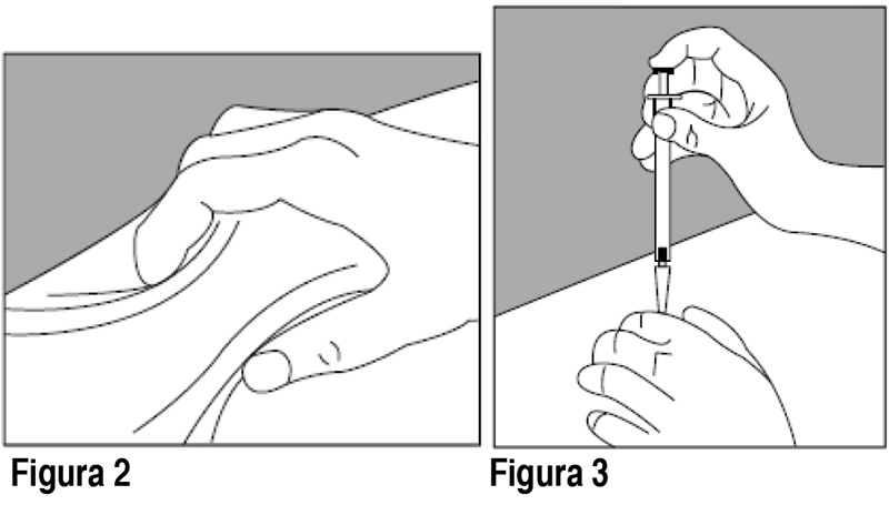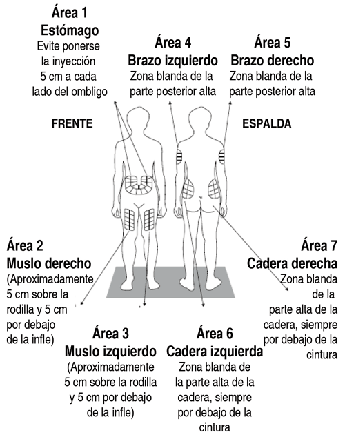 Hay 7 posibles áreas para la inyección en su cuerpo: Estómago alrededor del ombligo (abdomen). La parte posterior y superior de sus brazos. La cadera superior (por debajo de la cintura). Los muslos (por encima de las rodillas). Para cada dosis de Escadra, elija un área de inyección diferente de 1 de las áreas que se muestran arriba. No introduzca la aguja en el mismo lugar (sitio) más de 1 vez cada semana. Cada área de la inyección contiene múltiples sitios de inyección para que usted pueda elegir. Evite la inyección en el mismo sitio una y otra vez. Mantenga un registro de los sitios donde se aplica la inyección cada día para que se acuerde en la que ya inyectó. Paso 5: Prepárese para administrar su inyección. Hay algunas zonas de inyección en su cuerpo que son difíciles de alcanzar (como la parte posterior y superior de su brazo). Es posible que necesite la ayuda de alguien que haya sido instruido sobre cómo dar la inyección. No se inyecte en los sitios donde la piel tiene cicatrices o moretones. El uso de la piel con cicatrices o moretones para sus inyecciones puede empeorar su piel. Paso 6: Limpie el sitio de la inyección, utilizando algodón embebido con alcohol y deje que su piel se seque al aire. Paso 7: Tome la jeringa con una mano y sosténgala como un lápiz. Quite el capuchón de la aguja y manténgalo en reserva. Paso 8: Pellizque suavemente la piel haciendo un pliegue entre el dedo pulgar e índice (Figura 2). Paso 9: Con suavidad introduzca la aguja en la piel, manteniendo la jeringa en un ángulo de 90 grados (Figura 3). Cuando la aguja esté completamente dentro de su piel, suelte el pliegue de la piel.