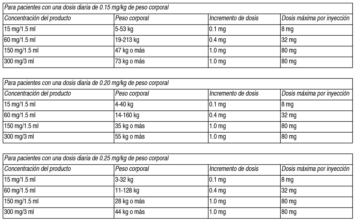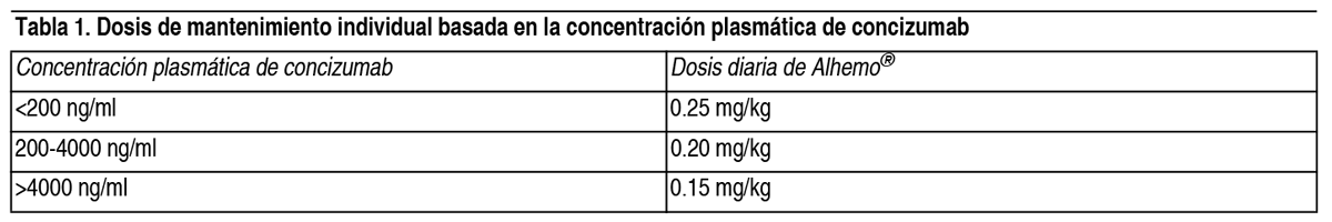 El ajuste de la dosis de mantenimiento individual debe realizarse lo antes posible (después de que esté disponible el resultado de la concentración plasmática de concizumab), y se recomienda que sea no más de 8 semanas después del inicio del tratamiento. Pueden realizarse determinaciones adicionales de la concentración plasmática de concizumab después de 8 semanas con la misma dosis de mantenimiento según la condición médica del paciente. Por ejemplo, esto puede considerarse si un paciente experimenta un aumento en la frecuencia de hemorragia, un gran cambio en el peso corporal, ha omitido dosis antes de establecer la dosis de mantenimiento o adquiere una comorbilidad que puede conducir a un aumento en el riesgo tromboembólico total. Dado que concizumab es dosificado en función del peso corporal (mg/kg), es importante recalcular la dosis (mg) cuando el peso corporal cambia. Cálculo de la dosis: La dosis (en mg) se calcula de la siguiente manera: Peso corporal del paciente (kg) x dosis (1, 0.15, 0.20 o 0.25 mg/kg) = cantidad total (mg) de concizumab a administrar. La dosis se selecciona en incrementos de: 0.1 mg en la lapicera de 15 mg/1.5 ml (color azul), 0.4 mg en la lapicera de 60 mg/1.5 ml (color marrón) y 1.0 mg en las lapiceras de 150 mg/1.5 ml y 300 mg/3 ml (color dorado). La dosis calculada se redondea a la dosis inyectable de la lapicera más cercana. El médico o enfermero debe ayudar al paciente a redondear e identificar la dosis inyectable adecuada en la lapicera. Idealmente, los pacientes deberían recibir la prescripción y utilizar una lapicera que pueda administrar la dosis de mantenimiento diaria requerida en una sola inyección. La dosis inyectable más cercana puede identificarse girando el tambor de la lapicera o calcularse como se indica a continuación: Divida la dosis total en mg por la dosis del incremento. Redondee al número entero más cercano. Multiplique por la dosis del incremento. Ejemplos: Paciente con un peso corporal de 42 kg, utilizando una dosis de mantenimiento de 0.15 mg/kg. Día 1, utilizando una dosis de carga de 1 mg/kg: 42 kg x 1 mg/kg = 42 mg de concizumab. Día 2 y hasta que se establezca la dosis de mantenimiento individual, utilizando una dosis de 0.20 mg/kg: 42 kg x 0.20 mg/kg = 8.4 mg de concizumab. Dosis de mantenimiento: 42 kg x 0.15 mg/kg = 6.3 mg de concizumab. El paciente debe recibir 6.3 mg de concizumab con una lapicera de 60 mg/1.5 ml para obtener la mayor duración de la lapicera (en días) para el peso corporal de este paciente. Para identificar la dosis inyectable más cercana: 6.3 mg dividido 0.4 mg/incremento = 15.75 incrementos. 15.75 incrementos se redondea a 16 incrementos. 16 incrementos multiplicado por 0.4 mg/incremento = 6.4 mg. 6.4 mg es una dosis seleccionable en la lapicera de 60 mg/1.5 ml y es la dosis inyectable más cercana a 6.3 mg. Paciente con un peso corporal de 67 kg, utilizando una dosis de mantenimiento de 0.20 mg/kg: Día 1, utilizando una dosis de carga de 1 mg/kg: 67 kg x 1 mg/kg = 67 mg de concizumab. Día 2 y hasta que se establezca la dosis de mantenimiento individual, utilizando una dosis de 0.20 mg/kg: 67 kg x 0.20 mg/kg = 13.4 mg de concizumab. Dosis de mantenimiento: 67 kg x 0.20 mg/kg = 13.4 mg de concizumab. El paciente debe recibir 13.4 mg de concizumab con una lapicera de 300 mg/3 ml para obtener la mayor duración de la lapicera (en días) para el peso corporal de este paciente. Para identificar la dosis inyectable más cercana: 13.4 mg dividido 1.0 mg/incremento = 13.4 incrementos-13.4 incrementos se redondea a 13 incrementos. 13 incrementos multiplicado por 1.0 mg/incremento = 13.0 mg. 13.0 mg es una dosis seleccionable en la lapicera de 300 mg/3 ml y es la dosis inyectable más cercana a 13.4 mg. Elección de la concentración y el volumen del producto: En función de las características técnicas, las lapiceras Alhemo® pueden adaptarse a los siguientes rangos de peso corporal: