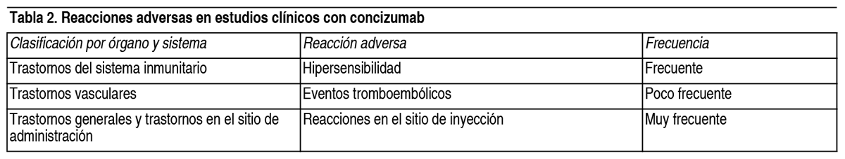 Descripción de reacciones adversas seleccionadas: Reacciones en el sitio inyección: Se informaron reacciones en el sitio de inyección en los estudios clínicos de dosis múltiples. Los síntomas notificados con mayor frecuencia fueron eritema en el sitio de inyección (5.9 %), moretones en el sitio de inyección (4.4 %) y hematomas en el sitio de inyección (4.1 %). La mayoría se informaron como leves. Población pediátrica: 78 de los participantes en estudios clínicos eran adolescentes (≥12 a <18 años). El perfil de seguridad fue similar entre los pacientes adolescentes y adultos, y fue el esperado para el grupo etario. La seguridad y eficacia de concizumab en niños menores de 12 años no fue establecida aún. No hay datos disponibles. Notificación de sospechas de reacciones adversas: Es importante notificar sospechas de reacciones adversas después de la autorización del medicamento. Esto permite un monitoreo continuo del balance riesgo/beneficio del medicamento. Se solicita a los profesionales de la salud que notifiquen cualquier sospecha de reacción adversa.