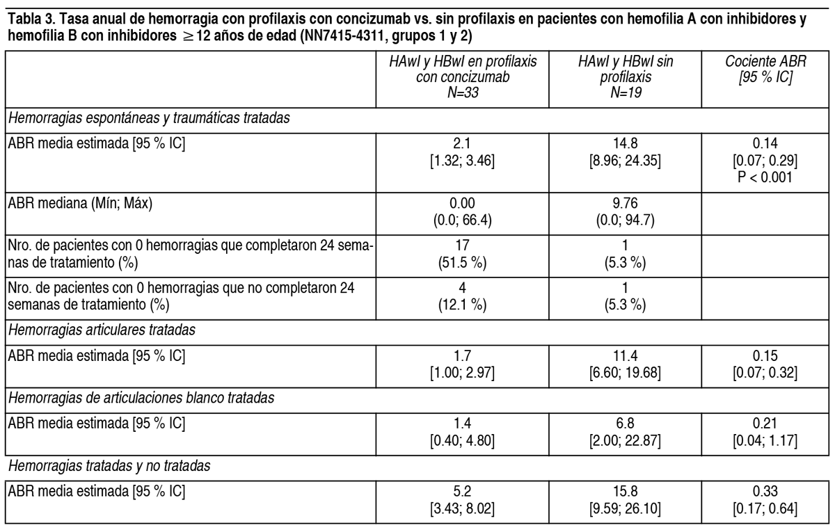 Propiedades:Propiedades farmacodinámicas: Mecanismo de acción: Concizumab es un anticuerpo dirigido contra el inhibidor de la vía del factor tisular (anti-TFPI). El TFPI es un inhibidor del factor Xa (FXa). La unión de concizumab al TFPI evita la inhibición del FXa por parte del TFPI. El aumento de la actividad del FXa prolonga la fase de iniciación de la coagulación y permite la generación de suficiente trombina para una hemostasia efectiva. Concizumab actúa independientemente del FVIII y el FIX. Datos farmacodinámicos: En el estudio NN7415-4311, la media de TFPI libre (TFPI plasmático no unido a concizumab) para los pacientes que recibieron profilaxis con concizumab disminuyó un 87 % dentro de las 24 horas posteriores a la administración de la dosis de carga de concizumab y se mantuvo estable a lo largo del tiempo. Concizumab restableció la capacidad de generación de trombina, reflejada por un pico medio de trombina dentro del rango del plasma normal y el 94 % de los pacientes presentando valores pico de trombina dentro del rango del plasma normal (26-147 nM) en el punto de corte a las 56 semanas. Transitoriamente, se informaron niveles pico de trombina moderadamente elevados en el 37.6 % de los pacientes, sin riesgos de seguridad asociados. Datos de eficacia clínica y seguridad: Pacientes con hemofilia A y B con inhibidores (HAwI y HBwI) de 12 años o más (NN74515-4311): El estudio NN7415-4311 fue un estudio de fase 3 multinacional, multicéntrico, abierto, para investigar la eficacia y la seguridad de concizumab para la profilaxis de episodios hemorrágicos en 91 pacientes adultos (58 con HAwI y 33 con HBwI) y 42 adolescentes (22 con HAwI y 20 con HBwI) masculinos con hemofilia A o B con inhibidores. El estudio estaba compuesto por 4 grupos, incluyendo 2 grupos no aleatorizados: Los grupos 1 y 2: 52 pacientes tratados previamente a demanda, fueron aleatorizados a sin profilaxis (tratamiento a demanda con agentes bypass; grupo 1) o profilaxis con concizumab (grupo 2), con ≥6 hemorragias tratadas en las últimas 24 semanas o ≥12 hemorragias tratadas en las últimas 52 semanas antes del reclutamiento, o que fueron transferidos del estudio NN7415-4322. Grupos 3 y 4: 81 pacientes adicionales (53 con HAwI y 28 con HBwI) tratados con profilaxis con concizumab. Los pacientes tenían 12 años de edad o más y un peso corporal >25 kg, con hemofilia A o B congénita de cualquier severidad con antecedentes documentados de inhibidores (≥0.6 BU), que habían sido prescritos o necesitaron tratamiento con agentes de bypass en las últimas 24 semanas anteriores al reclutamiento. Los pacientes recibieron un regimen posológico de acuerdo con las recomendaciones del prospecto. El objetivo primario del estudio fue comparar el efecto de la profilaxis con concizumab con la ausencia de profilaxis (tratamiento a demanda con agentes de bypass) respecto de la reducción del número de episodios de sangrado en pacientes adultos y adolescentes con hemofilia A y B con inhibidores (ver Tabla 3). Mediante un modelo binomial negativo, se estimó un cociente de las tasas anuales de hemorragia (ABR) de 0.14 (p <0.001), lo que corresponde a una reducción de la ABR del 86 % para los sujetos que recibieron profilaxis con concizumab en comparación con la ausencia de profilaxis. Un análisis adicional incluyendo toda la información disponible siguiendo el principio ITT (intención de tratar) muestra un cociente de la ABR estimado de 0.20 (95 % IC [0.09;0.45], p<0.001). Adicionalmente, se calculó el número de pacientes con cero hemorragias. La mediana de ABR y la cantidad de pacientes con cero hemorragias se muestran en la Tabla 3. La eficacia también se evaluó cuando todos los pacientes de los grupos 2, 3 y 4 habían completado al menos 56 semanas de tratamiento, y los resultados fueron consistentes con los resultados presentados en la Tabla 3.