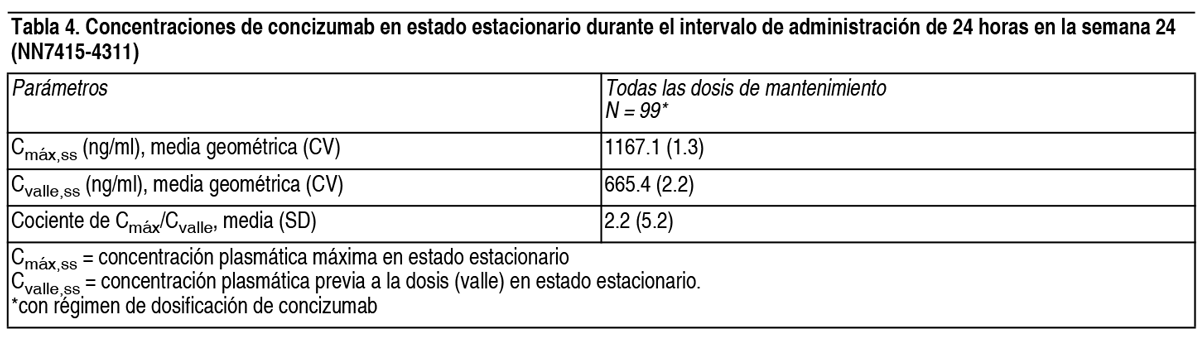 Valores de laboratorio de dímero D de fibrina y fragmentos 1+2 de protrombina aumentados: Se informaron niveles aumentados de dímero D de fibrina y fragmentos 1+2 en los estudios de dosis múltiples. La concentración plasmática de concizumab se correlaciona positivamente con el dímero D de fibrina y los fragmentos 1+2 de protrombina, lo que indica un efecto hemostático de concizumab. No se observaron cambios clínicamente significativos en el fibrinógeno, la antitrombina y las plaquetas. Población pediátrica: La seguridad y la eficacia en niños menores de 12 años aún no se han estudiado en un estudio clínico. Tratamiento de hemorragias intercurrentes en estudios clínicos: Mientras se utilizaba el régimen de dosificación de concizumab y la guía de hemorragias intercurrentes de la sección Posología y modo de administración, las hemorragias se trataron de manera efectiva y segura, y no se observaron eventos tromboembólicos. La seguridad y eficacia del uso concomitante del régimen posológico de profilaxis con concizumab y el tratamiento de hemorragias intercurrentes se confirmaron en el estudio NN7415-4311. Un total de 408 episodios hemorrágicos se trataron con rFVIIa (mayoría) y FEIBA (≥56 semanas para los grupos de tratamiento con concizumab). Inmunogenicidad: Durante los períodos de tratamiento en los estudios NN7415-4159 (11 semanas), NN7415-4310 y NN7415-4255 (≥76 semanas), NN7415-4311 (≥56 semanas para los grupos de tratamiento con concizumab) y NN7415-4307 (≥32 semanas para los grupos de tratamiento con concizumab), 68 de los 320 pacientes tratados con concizumab (21.3 %) resultaron positivos para anticuerpos anti-concizumab, de los cuales 17 pacientes (5.3 %) resultaron positivos para anticuerpos neutralizantes in vitro. En 1 (1.5 %) de los 68 pacientes positivos para anticuerpos anti-concizumab, los anticuerpos neutralizantes in vitro coocurrieron con la restauración de los niveles de TFPI libre. En los 67 pacientes restantes (98.5 %), no se identificó ningún efecto clínicamente significativo de los anticuerpos sobre la farmacocinética, farmacodinámica, seguridad o efectividad de concizumab. Propiedades farmacocinéticas: Los estudios farmacocinéticos han demostrado que la exposición sistémica a concizumab, medida por el AUC y la Cmáx, aumentó más que proporcionalmente a la dosis. Este comportamiento farmacocinético no lineal es causado por la disposición del fármaco mediada por el blanco (TMDD), que ocurre cuando concizumab se une al TFPI unido a células endoteliales con posterior eliminación del complejo fármaco-blanco. Este es un proceso saturable y el alcance de la eliminación de concizumab mediante TMDD se determina por la cantidad de TFPI unido a células endoteliales. Esto da lugar a una eliminación rápida/alto clearance a concentraciones bajas de concizumab (donde la vía no lineal es dominante) y una eliminación más lenta/menor clearance a concentraciones más altas de concizumab (donde la vía lineal es dominante). La exposición a concizumab fue similar entre la hemofilia A y la B con inhibidores. Las concentraciones medias geométricas de concizumab en estado estacionario, en la semana 24, se muestran en la Tabla 4. Las concentraciones plasmáticas previas a la dosis (valle) se mantuvieron estables durante las 56 semanas de tratamiento.