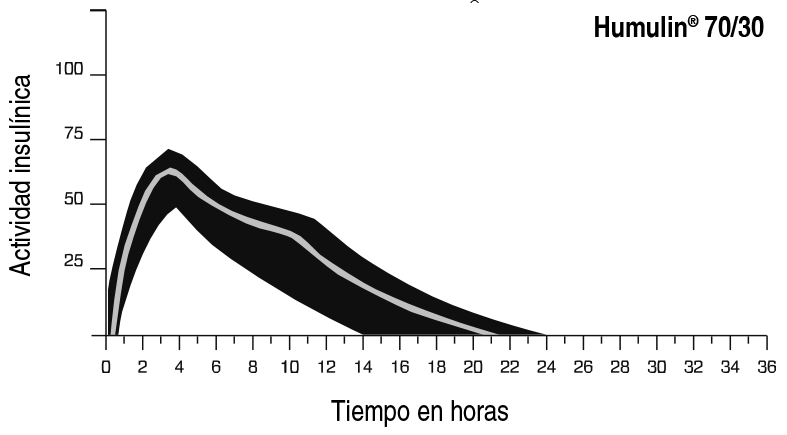 Propiedades:Propiedades farmacodinámicas: La principal acción de la insulina es la regulación del metabolismo de la glucosa. Además, la insulina tiene diversas acciones anabólicas y anticatabólicas sobre una variedad de tejidos. Dentro del tejido muscular, se incluyen el incremento de glucógeno, ácidos grasos, glicerol, síntesis proteica y captación de aminoácidos, mientras que disminuye la glucogenólisis, gluconeogénesis, cetogénesis, lipolisis, catabolismo proteico y la pérdida de aminoácidos. El perfil de actividad típico (curva de utilización de glucosa), tras la administración subcutánea se ilustra en las gráficas siguientes con la línea más oscura. Las variaciones que un determinado paciente puede experimentar en los tiempos y/o la intensidad de la actividad de la insulina se ilustran por el área sombreada. La variabilidad individual dependerá de factores tales como la dosis, la temperatura en el lugar de la inyección y la actividad física del paciente.