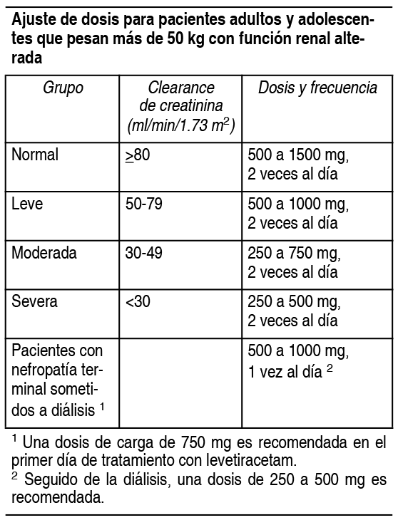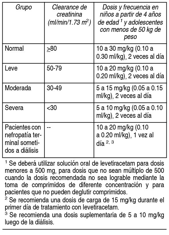 Posología: Se puede iniciar la terapia con levetiracetam con administración intravenosa u oral. La conversión desde o hasta la administración intravenosa puede realizarse en forma directa, sin titulación de dosis. La dosis diaria total y frecuencia de administración deberán mantenerse. La solución oral puede ser diluida en un vaso de agua y puede ser administrada con o sin alimentos. La dosis diaria se administra en 2 dosis divididas equitativamente. Después de la administración oral, se puede experimentar el sabor amargo de levetiracetam. Vía de administración: Para uso oral. Adultos: Monoterapia: Adultos y adolescentes desde 16 años de edad: La dosis inicial recomendada son 250 mg, 2 veces al día, la cual debe incrementarse hasta la dosis terapéutica inicial de 500 mg, 2 veces al día, tras 2 semanas de tratamiento. La dosis puede incrementarse en 250 mg, 2 veces al día, cada 2 semanas, dependiendo de la respuesta al tratamiento. La dosis máxima corresponde a 1500 mg, 2 veces al día. Terapia concomitante: Adultos (≥18 años) y adolescentes (de 12 a 17 años) con un peso de 50 kg o superior: La dosis terapéutica inicial es de 500 mg, 2 veces al día. Esta dosis se puede instaurar desde el primer día de tratamiento. Dependiendo de la respuesta clínica y de la tolerabilidad, la dosis diaria se puede incrementar hasta 1500 mg, 2 veces al día. La modificación de la dosis se puede realizar con aumentos o reducciones de 500 mg, 2 veces al día, cada 2 a 4 semanas. Niños: El médico debe prescribir la forma farmacéutica y concentración más apropiada de acuerdo con el peso y la dosis. La formulación en comprimidos no está adaptada para su uso en niños menores de 6 años de edad. La solución oral de levetiracetam es la formulación preferida para uso en esta población. Además, las concentraciones disponibles de los comprimidos no son apropiadas para el tratamiento inicial en niños que pesan menos de 25 kg, para pacientes que no pueden tragar los comprimidos o para la administración de dosis menores a 500 mg. En todos los casos anteriores deberá utilizarse la solución oral de levetiracetam. Monoterapia: No se han establecido la seguridad y la eficacia como monoterapia en niños y adolescentes menores de 16 años. No hay datos disponibles. Terapia complementaria en niños entre los 4 y los 11 años de edad y adolescentes (de 12 a 17 años) con un peso inferior a 50 kg: La solución oral de levetiracetam es la formulación preferida para uso en niños menores de 6 años. Para niños de 6 años y mayores, levetiracetam solución oral debe usarse para dosis menores a 500 mg, cuando la dosis recomendada no sea múltiplo de 500 mg y no sea lograble mediante la toma de comprimidos de diferente concentración y para pacientes que no son capaces de deglutir comprimidos. La dosis terapéutica inicial es de 10 mg/kg, 2 veces al día. En función de la respuesta clínica y de la tolerabilidad, se puede aumentar la dosis hasta los 30 mg/kg, 2 veces al día. Los cambios de dosis no deberían exceder de aumentos/reducciones de 10 mg/kg, 2 veces al día, cada 2 semanas. Se debe utilizar la menor dosis eficaz. La dosificación en niños con un peso de 50 kg o superior es la misma que en adultos.