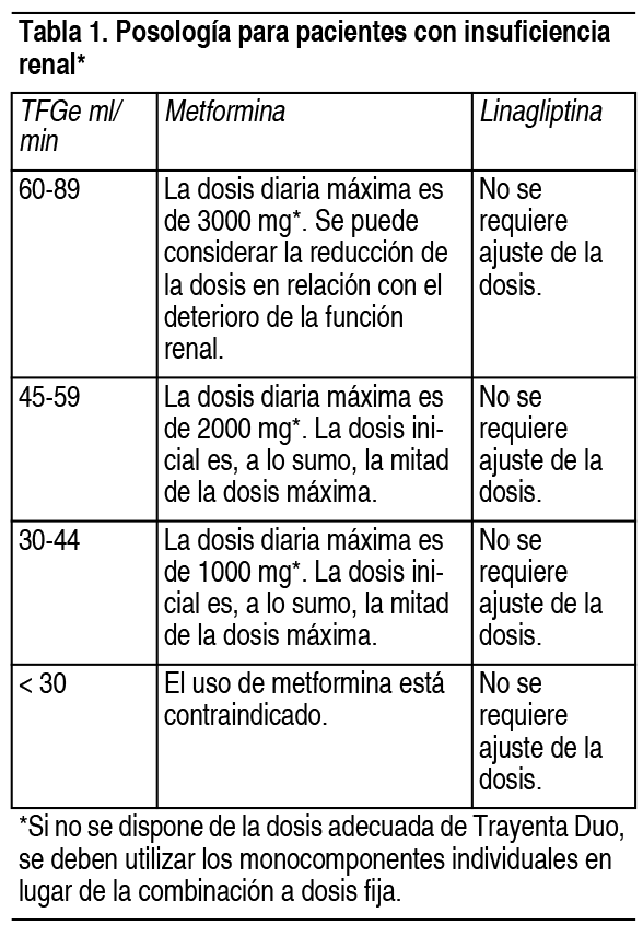 Posología: El médico debe indicar la posología y el tiempo de tratamiento apropiado a su caso particular, no obstante, la dosis recomendada es de 2.5/500 mg, 2.5/ 850 mg ó 2.5/1000 mg 2 veces por día. La dosis máxima recomendada de Trayenta Duo es de 5 mg de linagliptina y 2000 mg de metformina. Trayenta Duo debe tomarse junto con las comidas para reducir los efectos gastrointestinales indeseables asociados con la metformina. Para pacientes que no son tratados actualmente con metformina: Para pacientes que no son tratados actualmente con metformina, la dosis inicial recomendada es de 2.5 mg de linagliptina/ 500 mg de clorhidrato de metformina, 2 veces al día. Para pacientes en los que no se logra un control adecuado con la dosis máxima tolerada de la monoterapia con metformina: Para pacientes en los que no se logra un control adecuado con metformina sola, la dosis inicial de Trayenta Duo debe aportar linagliptina administrada en 2 tomas diarias de 2.5 mg cada una (dosis diaria total de 5 mg) más la dosis de metformina que ya esté tomando el paciente. Para pacientes que pasan de un régimen previo de coadministración de linagliptina y metformina: En los pacientes que pasan de un régimen previo de coadministración de linagliptina y metformina a la combinación de dosis fijas, Trayenta Duo debe iniciarse en un nivel que aporte la dosis de linagliptina y de metformina que el paciente ya estaba recibiendo. Pacientes en los que no se logra un control adecuado con la terapia combinada doble con la dosis máxima tolerada de metformina y una sulfonilurea: La dosis de Trayenta Duo debe aportar linagliptina administrada en 2 tomas diarias de 2.5 mg cada una (dosis diaria total de 5 mg) y una dosis de metformina similar a la que ya estaba tomando el paciente. Cuando Trayenta Duo se usa en combinación con una sulfonilurea, se puede indicar una dosis más baja de la sulfonilurea, para reducir el riesgo de hipoglicemia. Pacientes en los que no se logra un control adecuado con la terapia combinada doble con insulina y la dosis máxima tolerada de metformina: La dosis de Trayenta Duo debe aportar linagliptina administrada en 2 tomas diarias de 2.5 mg cada una (dosis diaria total de 5 mg) y una dosis de metformina similar a la que ya estaba tomando el paciente. Cuando Trayenta Duo se usa en combinación con insulina, se puede indicar una dosis más baja de insulina, para reducir el riesgo de hipoglicemia. Para las diferentes dosis de metformina, Trayenta Duo está disponible en concentraciones de: 2.5 mg de linagliptina más 500 mg de clorhidrato de metformina, 850 mg de clorhidrato de metformina o 1000 mg de clorhidrato de metformina. Insuficiencia renal: Se debe evaluar la TFG antes de iniciar el tratamiento con productos que contengan metformina y, al menos, una vez al año a partir de entonces. En los pacientes expuestos a un mayor riesgo de progresión de la insuficiencia renal y en pacientes de edad avanzada, se debe evaluar la función renal con mayor frecuencia, por ej. cada 3-6 meses. Se deben revisar los factores que puedan aumentar el riesgo de acidosis láctica antes de considerar el inicio del tratamiento con metformina en los pacientes con TFG <60 ml/min.