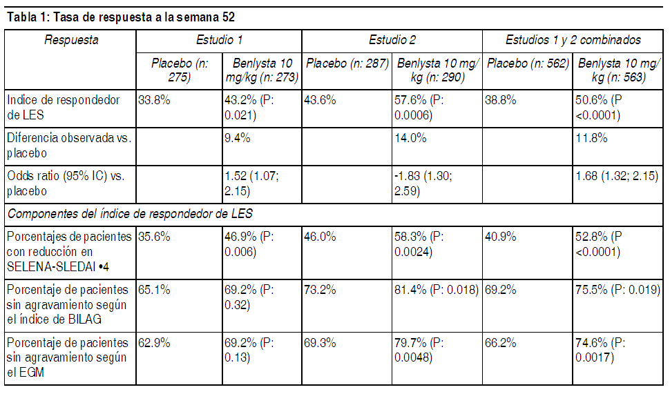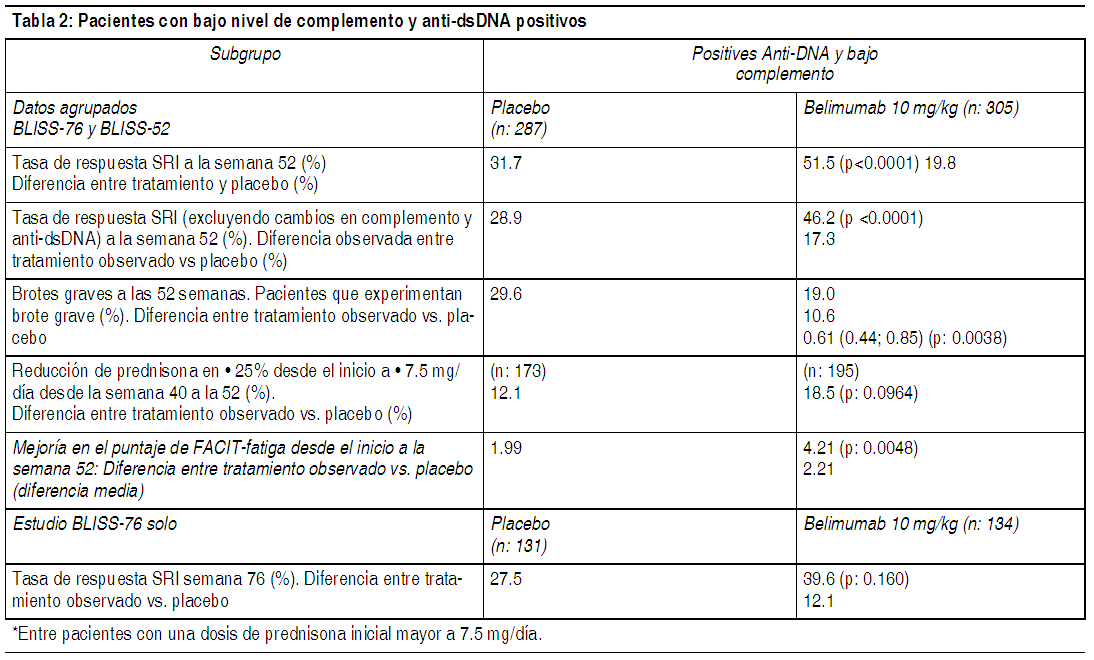 En un análisis combinado de los 2 estudios, el porcentaje de pacientes que estaban recibiendo más de 7.5 mg/día de prednisona (o su equivalente) en la línea basal, y cuya dosis promedio de corticoesteroide se redujo por lo menos en 25% respecto a la línea basal a una dosis equivalente a menor o igual 7.5 mg/día de prednisona durante las Semanas 40 a 52, fue de 17.9% en el grupo que estaba recibiendo belimumab y de 12.3% en el grupo tratado con placebo (P=0.0451). Los brotes de LES se definieron mediante el Índice Modificado de Brotes de LES de SELENA SLEDAI, en el que la modificación excluye brotes graves desencadenados únicamente por un incremento en la calificación de SELENA SLEDAI a un valor mayor que 12. La mediana de tiempo hasta el primer brote experimentó un retraso en el grupo combinado que estaba recibiendo belimumab, en comparación con el grupo tratado con placebo (cuociente de riesgo = 0.84, P=0.012). Los brotes graves se observaron en el 15.6% del grupo que recibió Benlysta frente al 23.7% del grupo placebo durante las 52 semanas de observación (diferencia de tratamiento observada = -8.1%; hazard ratio=0.64; p=0.0011). El análisis univariado y multivariado de los puntos finales primarios demostró que el mayor beneficio fue observado en pacientes alta actividad de la enfermedad al inicio, incluyendo pacientes con escalas SELENA SENDAI mayores o iguales a 10, pacientes que requieren esteroides para controlar su enfermedad y pacientes con bajos niveles de complemento. Un análisis post-hoc identificó una alta respuesta en el subgrupo de pacientes con bajo nivel de complemento y anticuerpos anti dsDNA positivos al inicio, ver tabla 2. De estos pacientes el 64.5% tenía escala de SELENA SENDAI mayor o igual a 10 con respecto al inicio.