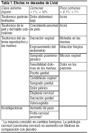 Efectos Colaterales: Este punto describe los efectos no deseados que se registraron en 21 estudios controlados con placebo (incluido el estudio LIFT) en 4.079 mujeres que recibieron dosis terapéuticas (1.25 ó 2.5 mg) de tibolona y 3.476 mujeres que recibieron placebo. La duración del tratamiento en estos estudios osciló entre 2 meses y 4.5 años. La siguiente tabla 1 muestra los efectos no deseados que ocurrieron con una frecuencia significativamente mayor desde el punto de vista estadístico durante el tratamiento con tibolona que con placebo.