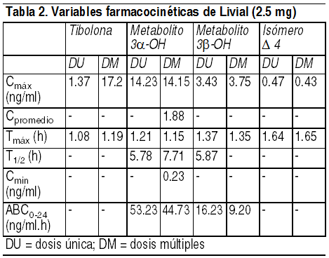 Propiedades:Propiedades farmacodinámicas: Luego de la administración oral, la tibolona se metaboliza rápidamente en 3 compuestos, los cuales contribuyen al perfil farmacodinámico de Livial. 2 de los metabolitos (3α-OH-tibolona y 3ß-OH-tibolona) tienen actividades estrogénicas, mientras que el tercer metabolito (isómero 4 de la tibolona) tiene actividades progestagénicas y androgénicas. Livial reemplaza la pérdida de la producción de estrógenos en las mujeres postmenopáusicas, y alivia los síntomas menopáusicos. Livial previene la pérdida ósea luego de la menopausia o la ooforectomía. Información de los estudios clínicos realizados con Livial:Alivio de los síntomas de deficiencia estrogénica: Por lo general, el alivio de los síntomas menopáusicos ocurre desde las primeras semanas de tratamiento. Efectos sobre el endometrio y los patrones de sangrado: Se informó hiperplasia endometrial y cáncer de endometrio en pacientes tratadas con tibolona (ver Advertencias). Se informó amenorrea en el 88% de las mujeres que utilizaron tibolona 2.5 mg después de 12 meses de tratamiento. Se informó sangrado por disrupción y/o manchado en el 32.6% de las mujeres durante los primeros 3 meses de tratamiento, y en el 11.6% de las mujeres después de 11-12 meses de uso. Prevención de la osteoporosis: La deficiencia estrogénica en la menopausia está asociada con mayor recambio óseo y deterioro de la masa ósea. La protección parece ser efectiva mientras continúa el tratamiento. Luego de la discontinuación de la TH, la masa ósea se pierde a una velocidad similar a la observada en mujeres no tratadas. En el estudio LIFT, la tibolona redujo la cantidad de mujeres (media de edad 68 años) con fracturas vertebrales nuevas en comparación con el placebo durante los 3 años de tratamiento (ITT: riesgo relativo tibolona/placebo 0.57; IC95%: 0.42 a 0.78). Después de 2 años de tratamiento con Livial (2.5 mg), el aumento de la densidad mineral ósea (DMO) de la columna lumbar fue de 2.6±3.8%. El porcentaje de mujeres que conservó o aumentó la DMO de la zona lumbar durante el tratamiento fue del 76%. Un segundo estudio confirmó estos resultados. Livial (2.5 mg) también tuvo un efecto sobre la DMO de la cadera. En un estudio, su aumento después de 2 años fue del 0.7±3.9% en el cuello del fémur y del 1.7%±3.0% en cadera total. El porcentaje de mujeres que conservaron o aumentaron la DMO en la zona de la cadera durante el tratamiento fue del 72.5%. Un segundo estudio demostró que el aumento después de 2 años fue del 1.3±5.1% en el cuello del fémur y del 2.9±3.4% en cadera total. El porcentaje de mujeres que conservaron o aumentaron la DMO en la zona de la cadera durante el tratamiento fue del 84.7%. Efectos sobre la mama: En los estudios clínicos, la densidad mamográfica no aumenta en las mujeres tratadas con Livial en comparación con placebo. Propiedades farmacocinéticas: Luego de la administración oral, la tibolona se absorbe rápida y completamente. Debido a su metabolismo, los niveles plasmáticos de la tibolona son muy bajos. Los niveles plasmáticos del isómero 4 también son muy bajos. Por lo tanto, algunos de los valores de las variables farmacocinéticas no pudieron ser determinados. Los niveles máximos de los metabolitos 3α-OH y 3ß-OH en el plasma son más elevados pero no se observa acumulación.