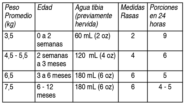 Posología:Modo de uso: Si no se siguen estrictamente las indicaciones de preparación e higiene éste o cualquier otro alimento es perjudicial para la salud del niño/a. 1.- Lave bien sus manos y todos los utensilios utilizados para la alimentación. 2.- Hierva todos los utensilios por 5 minutos. Mantenga tapados los recipientes limpios hasta el momento de su utilización. 3.- Hierva agua potable por 5 minutos. No hierva excesivamente el agua. Cuando el agua esté tibia, vierta la cantidad correcta en el biberón. 4.- Utilizando el medidor que se incluye dentro del envase, mida la cantidad correcta de polvo. Nivele el medidor con un cuchillo limpio y seco. Agregue el polvo al agua. 5.- Tape el recipiente, agítelo bien, luego verifique la temperatura dejando caer unas pocas gotas sobre la parte interna de su muñeca. La preparación debe estar tibia. Preparación: 1 medida rasa de polvo (4.3 g) en 30 ml de agua hervida y tibia. Porción: 2 medidas rasas (8.6 g) con 60 ml de agua hervida y tibia = 60 ml. Porciones por envase: 105 aproximadamente. Tabla de preparación: Basada en los requerimientos promedios. Seguir las proporciones recomendadas a continuación, a menos que su doctor le indique otra forma. No prepare la toma más concentrada o más diluida agregando polvo o agua adicional. Los lactantes mayores de seis meses de edad, requieren alimentos complementarios además de la fórmula.