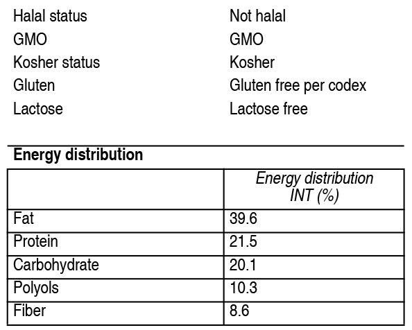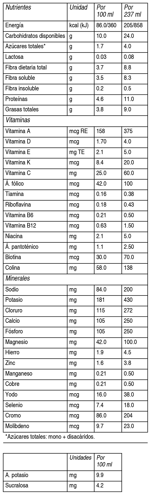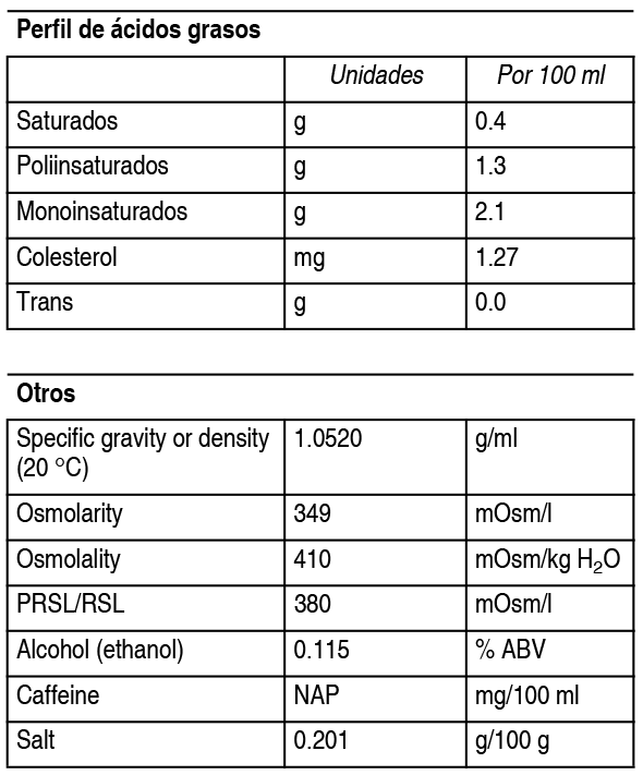 Composición: Contiene: Agua, Maltodextrina de Maíz, Aceites Vegetales (aceite de cártamo alto en oleico, aceite de canola, aceite soya), Caseinato de Calcio, Glicerina, Sucromaltosa, Proteína de Soya, Minerales (fosfato de magnesio, citrato de potasio, citrato de sodio, cloruro de potasio, fosfato de calcio, cloruro de sodio, cloruro de magnesio, sulfato ferroso, sulfato de zinc, picolinato de cromo, sulfato de manganeso, sulfato cúprico, molibdato de sodio, yoduro de potasio, selenato de sodio), Concentrado de Proteína de Leche, Fructooligosacáridos de cadena corta (FOS), Fructosa, Sabor Natural y Artificial a Vainilla, Mionositol, Isomaltulosa, Fibra de Avena, Lecitina de Soya (emulsificante), Vitaminas (ácido ascórbico, cloruro de colina, acetato de dl-alfa tocoferilo, niacinamida, pantotenato de calcio, palmitato de vitamina A, clorhidrato de piridoxina, clorhidrato de cloruro de tiamina, riboflavina, ácido fólico, biotina, filoquinona, cianocobalamina, vitamina D3), Carragenina (estabilizante), Acesulfame de Potasio (edulcorante), Sucralosa (edulcorante). Alérgenos: Concentrado de Proteína de Leche (leche), Concentrado de Proteína y Lecitina de Soya (soya). Porciones por envase: 1 porción.