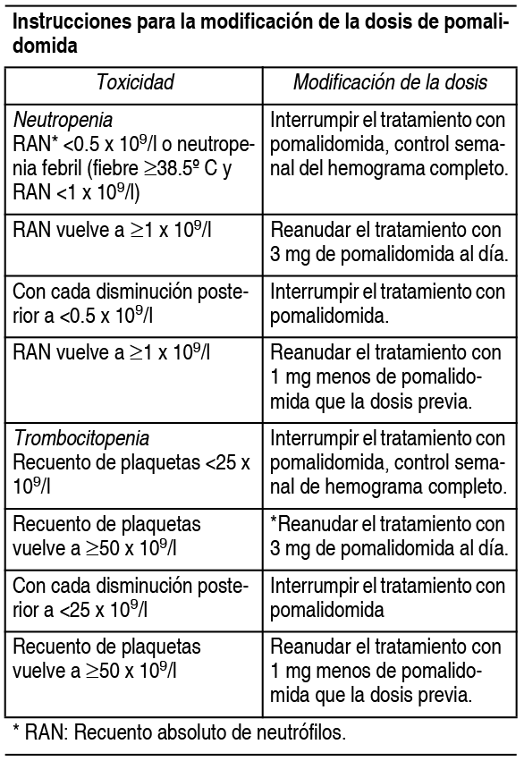 Para iniciar un nuevo ciclo de pomalidomida, el recuento de neutrófilos debe ser ≥1 x 109/l y el recuento de plaquetas debe ser ≥50 x 109/l. En caso de neutropenia, el médico debe considerar el uso de factores de crecimiento. En el caso de otras reacciones adversas de grado 3 ó 4 relacionadas con pomalidomida, el médico debe considerar interrumpir el tratamiento y reanudarlo con un 1 mg menos que la dosis previa una vez que se haya disminuido la reacción adversa a un grado inferior o igual a 2. Si la reacción adversa ocurre tras disminuciones de la dosis a 1 mg, entonces debe suspenderse el tratamiento con este medicamento.