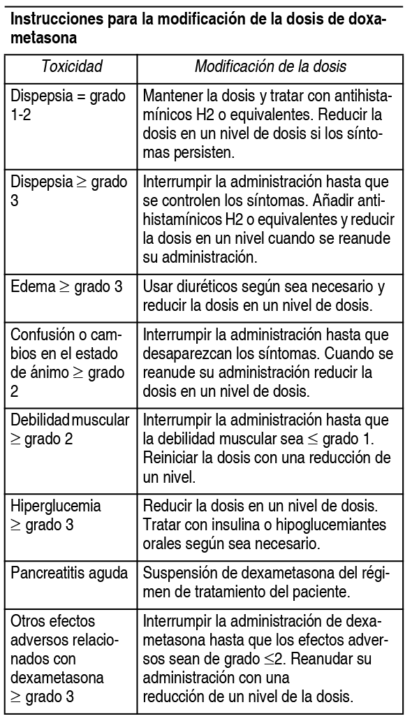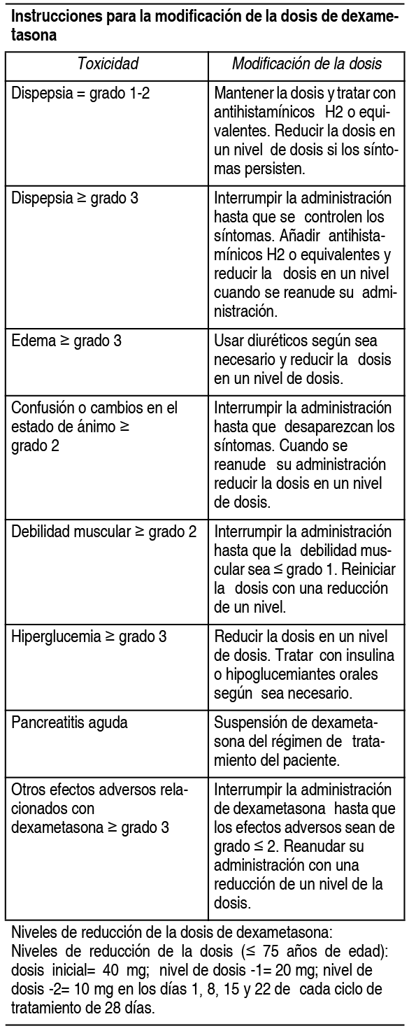 Posología: El tratamiento debe iniciarse y monitorizarse bajo la supervisión de médicos con experiencia en el tratamiento del mieloma múltiple. Posología: La dosis inicial recomendada es de 4 mg de Pomalyst 1 vez al día por vía oral, en los días del 1 al 21 de ciclos repetidos de 28 días. La dosis recomendada de dexametasona es de 40 mg por vía oral 1 vez al día, en los días 1, 8, 15 y 22 de cada ciclo de tratamiento de 28 días. La posología se mantiene o modifica en función de los resultados clínicos y de laboratorio. El tratamiento debe suspenderse si existe evidencia de progresión de la enfermedad. Modificación o interrupción de la dosis de pomalidomida: Las instrucciones para la interrupción y reducción de la dosis de pomalidomida relacionada con reacciones adversas hematológicas se indican en la siguiente tabla:
