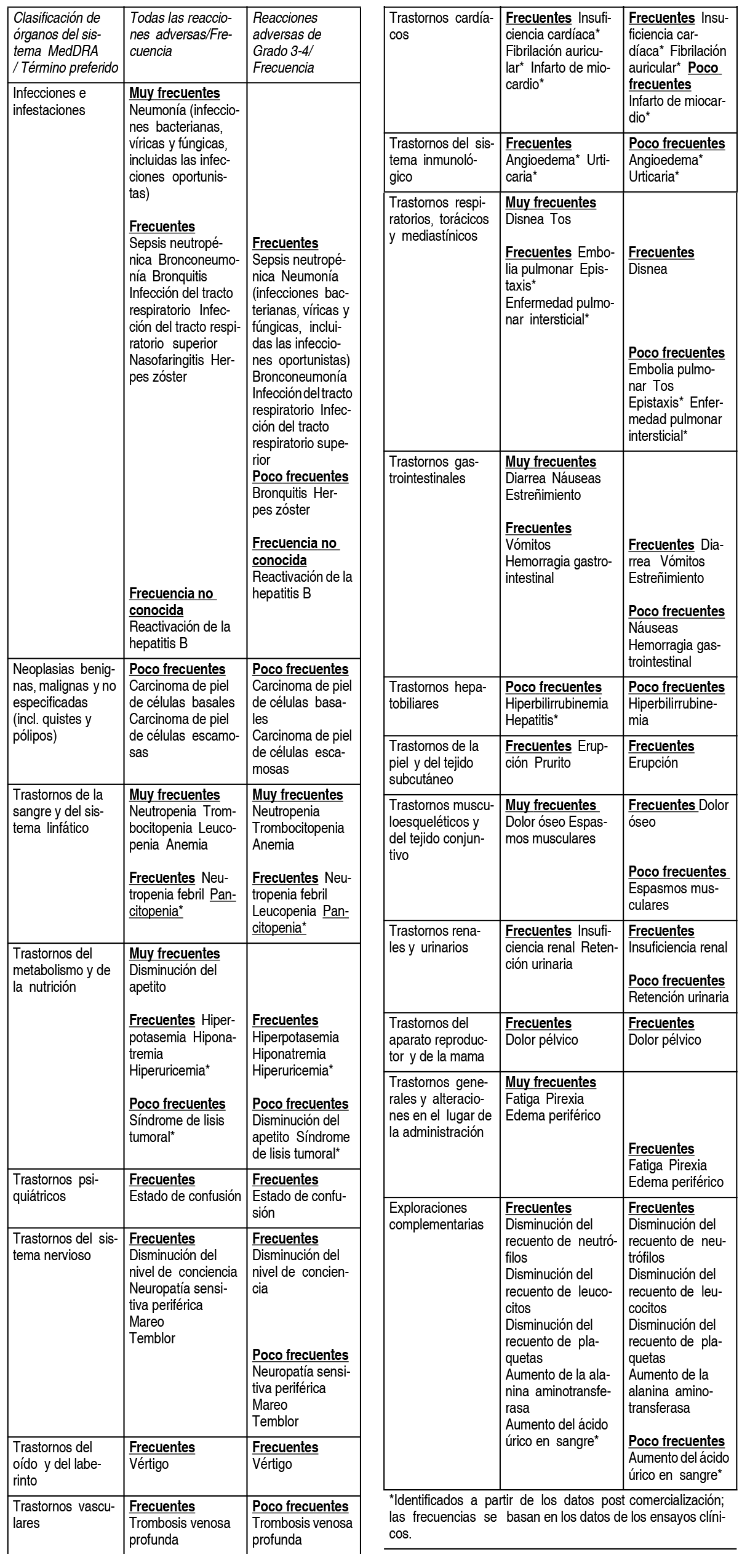 Efectos Colaterales:Resumen del perfil de seguridad: Las reacciones adversas notificadas con mayor frecuencia en los estudios clínicos han sido los trastornos de la sangre y del sistema linfático, incluyendo anemia (45.7%), neutropenia (45.3%) y trombocitopenia (27%); trastornos generales y alteraciones en el lugar de la administración, incluyendo fatiga (28.3%), pirexia (21%) y edema periférico (13%); e infecciones e infestaciones incluyendo neumonía (10.7%). Las reacciones adversas relacionadas con neuropatía periférica fueron notificadas en el 123% de los pacientes y las reacciones adversas de embolismo o tromboembolismo venoso fueron notificadas en el 3.3% de los pacientes. Las reacciones adversas de grado 3 ó 4 más frecuentes estaban relacionadas con trastornos de la sangre y del sistema linfático, incluyendo neutropenia (41.7%), anemia (27%) y trombocitopenia (20.7%); infecciones e infestaciones, incluyendo neumonía (9%); y trastornos generales y alteraciones en el lugar de la administración, incluyendo fatiga (4.7%), pirexia (3%) y edema periférico (1.3%). La reacción adversa grave notificada con mayor frecuencia fue la neumonía (9.3%). Otras reacciones adversas graves notificadas incluyen neutropenia febril (4.0%), neutropenia (2.0%), trombocitopenia (1.7%) y reacciones adversas de TEV (1.7%). Se observó que las reacciones adversas tendían a ocurrir con mayor frecuencia dentro de los primeros 2 ciclos de tratamiento con pomalidomida. Lista tabulada de reacciones adversas: En el estudio aleatorizado CC-4047-MM-003, un total de 302 pacientes con mieloma múltiple en recaída y refractario fueron tratados con 4 mg de pomalidomida administrada 1 vez al día durante 21 días en cada ciclo de 28 días, en combinación con una dosis baja semanal de dexametasona. Las reacciones adversas observadas en los pacientes tratados con pomalidomida y dexametasona se incluyen a continuación, según el sistema de clasificación por órganos y la frecuencia (SOC por sus siglas en inglés) para todas las reacciones adversas y para las reacciones adversas de Grado 3 ó 4. Las frecuencias de las reacciones adversas son las notificadas en el grupo de pomalidomida más dexametasona del estudio CC-4047-MM-003 (n=302) y de los datos poscomercialización. Las reacciones adversas se presentan en orden decreciente de gravedad dentro de cada intervalo de SOC (por sus siglas en inglés) y de frecuencia. Las frecuencias se definen, según las guías actuales, como: muy frecuentes (≥1/10); frecuentes (≥1/100 a < 1/10) y poco frecuentes (≥1/1.000 a <1/100).