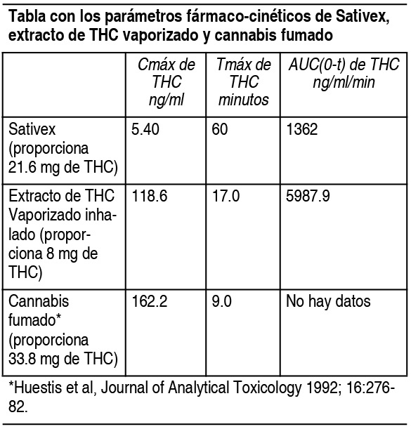 Propiedades:Propiedades farmacodinámicas: La Agencia Europea de Medicamentos ha aplazado la obligación de presentar los resultados de los estudios con Sativex en 1 o más subgrupos de la población pediátrica con espasticidad. Ver sección Posología para información sobre el uso pediátrico. Mecanismo de acción: Como parte del sistema endocannabinoide (SEC) humano, los receptores de cannabinoides CB1 y CB2 se encuentran predominantemente en las terminaciones nerviosas, donde intervienen en la regulación retrógrada de la función sináptica. El THC actúa como agonista parcial en los receptores CB1 y CB2, imitando los efectos de los endocannabinoides, que pueden modular los efectos de los neurotransmisores (por ejemplo, reducir los efectos de neurotransmisores excitatorios como el glutamato). En modelos animales de EM y espasticidad, los agonistas de los receptores CB han mostrado reducirla rigidez de las extremidades y mejorar la función motora. Los antagonistas CB evitan estos efectos y los ratones con CB1 inactivados muestran una espasticidad más grave. En el modelo de ratón con encefalomielitis autoinmune experimental crónica recurrente (EAECR), Sativex produjo una reducción de la rigidez en las extremidades posteriores dosis-dependiente.Propiedades farmacocinéticas: Absorción: Tras la administración de Sativex (4 pulverizaciones), tanto THC como CBD se absorben rápidamente y se detectan en el plasma al cabo de 15 minutos después de una única administración bucal. Con Sativex se alcanzó una Cmáx media de aproximadamente 4 ng/ml unos 45-120 después de la administración de una única dosis de 10.8 mg de THC y en general se toleró bien, con poca evidencia de psico-actividad significativa. Al administrar Sativex junto con alimentos, la Cmáx media y el AUC del THC fueron 1.6 y 2.8 veces superiores en comparación con las condiciones en ayunas. Las cifras correspondientes para el CBD fueron 3.3 y 5.1 veces superiores, respectivamente. Existe un alto grado de variabilidad en los parámetros farmacocinéticos entre pacientes. Tras la administración de una única dosis de Sativex (4 pulverizaciones) en ayunas, el nivel plasmático medio de THC mostró un coeficiente de variación (CV) del 57.3% para la Cmáx (intervalo: 0.97-9.34 ng/ml) y un CV del 58.5% para el AUC (intervalo: 4.2-30.84 h*ng/ml). Asimismo, el porcentaje de CV para CBD fue del 64.1% (intervalo: 0.24-2.57 ng/ml) y del 72.5% (intervalo: 2.18-14.85 ng/ml) para los mismos parámetros respectivamente. Después de 9 días consecutivos de administración, los porcentajes de CV para los mismos parámetros fueron del 54.2% (intervalo Cmáx = 0.92-6.37) y del 37.4% (AUC0-t: 5.34-15.01h*ng/ml) para THC y del 75.7% (intervalo Cmáx = 0.34-3.39 ng/ml) y del 46.6% (AUC0-t: 2.40-13.19 h*ng/ml) para CBD, respectivamente. Existe un alto grado de variabilidad en los parámetros farmacocinéticos entre los pacientes que reciben una dosis única y dosis repetidas. De 12 pacientes que recibieron 4 pulverizaciones de Sativex como dosis única, 8 presentaron reducciones en la Cmáx después de 9 días de múltiples dosis, mientras que 3 presentaron aumentos (1 abandonó). Para CBD, 7 presentaron reducciones en la Cmáx después de dosis múltiples, mientras que 4 experimentaron aumentos. Cuando Sativex se administra por vía bucal, los niveles plasmáticos de THC y demás cannabinoides son inferiores en comparación con los obtenidos tras la inhalación de cannabinoides aun a dosis similar. Una dosis de 8 mg de extracto de THC vaporizado administrado mediante inhalación dio lugar a una Cmáx plasmática media de más de 100 ng/ml pocos minutos después de la administración, con una psicoactividad significativa.