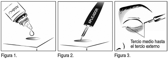 Humedezca la punta del aplicador con Atidex® (como lo indica la figura 2). Aplique Atidex® en la base (raíz) de las pestañas, desde el tercio medio hasta el tercio externo del párpado superior (como lo indica la figura 3). No aplique Atidex® en el párpado inferior ni directamente en el ojo. Realice el procedimiento anterior en el otro ojo. Limpiar cualquier excedente de Atidex®, fuera del margen del párpado superior, el ojo u otras estructuras anexas al ojo. Secar con un paño húmedo el recipiente donde se depositó el producto. Lavar el aplicador con agua, agitar para secar y guardar nuevamente en su recipiente.
