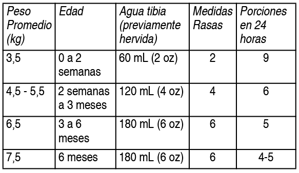 Posología:Modo de uso: Si no se siguen estrictamente las indicaciones de preparación e higiene éste o cualquier otro alimento es perjudicial para la salud del niño/a. 1.- Lave bien sus manos y todos los utensilios que va a usar. 2.- Hierva todos los elementos por 5 minutos. Mantenga tapados los recipientes limpios hasta el momento de su utilización. 3.- Hierva agua potable por 5 minutos. No hierva excesivamente el agua. Luego de hervida, cuando el agua esté tibia, vierta la cantidad correcta en el recipiente. 4.- Usando el medidor que se incluye dentro de la lata, mida la cantidad correcta de polvo. Use el lomo de un cuchillo limpio y seco para nivelar cada medidor al ras. Agregue el polvo al agua. 5.- Tape el recipiente, agítelo bien, luego verifique la temperatura dejando caer unas pocas gotas en su muñeca. La preparación debe estar tibia. Preparación: 1 medida rasa de polvo (4.2 g) en 30 ml de agua hervida y tibia. Porción: 2 medidas rasas (8.4 g) con 60 ml de agua hervida y tibia = 60 ml. Porciones por envase: 107 aproximadamente. Tabla de preparación: Siga las proporciones recomendadas en la tabla de preparación a menos que su médico le sugiera lo contrario.