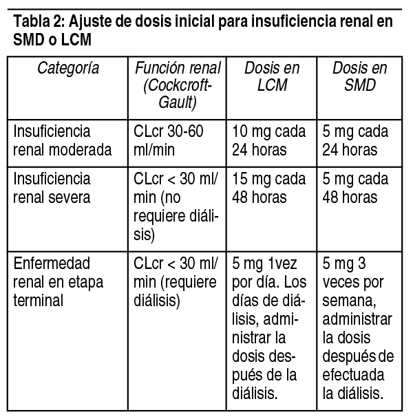 Otras toxicidades grados 3/4 en LCM: En cuanto a otras toxicidades grados 3/4 que se consideran relacionadas con Revlimid, suspender el tratamiento y reiniciar, según el criterio del médico, en el próximo nivel de dosis más bajo cuando la toxicidad se haya resuelto a ≤grado 2. Dosis inicial para insuficiencia renal en MM, SMD o LCM: Como Revlimid se excreta principalmente por el riñón sin metabolizar, se recomiendan ajustes a la dosis inicial para proporcionar una exposición adecuada al fármaco en pacientes con insuficiencia renal moderada o severa y en pacientes sometidos a diálisis. Sobre la base de un estudio farmacocinético en pacientes con insuficiencia renal debido a condiciones no malignas, se recomienda el ajuste de la dosis inicial de Revlimid para pacientes con CLcr < 60 ml/min. Las recomendaciones para las dosis iniciales para pacientes con SMD, LCM y MM son las siguientes: