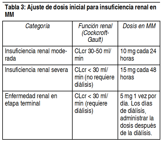 Insuficiencia renal moderada para MM: considerar la escalada de la dosis a 15 mg después de 2 ciclos si el paciente tolera la dosis de 10 mg de lenalidomida sin toxicidad limitante de la dosis. Tras el inicio de la terapia con Revlimid, el aumento o la disminución subsiguiente de la dosis de Revlimid debería basarse en la tolerancia al tratamiento de cada paciente, como se describe en otra parte.