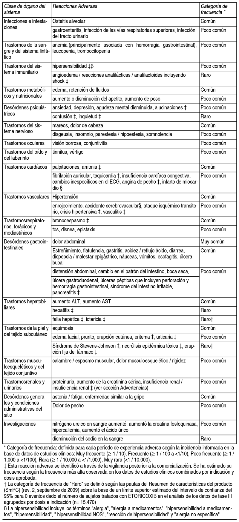 Efectos Colaterales:Resumen del perfil de seguridad: En estudios clínicos, se evaluó la seguridad de etoricoxib en 7.152 individuos, incluyendo 4.614 pacientes con OA, RA, dolor lumbar crónico o espondilitis anquilosante (aproximadamente 600 pacientes con artrosis o artritis reumatoide fueron tratados durante 1 año o más). En estudios clínicos, el perfil de efectos indeseables fue similar en pacientes con OA o RA tratados con etoricoxib durante 1 año o más. En un estudio clínico para la artritis gotosa aguda, los pacientes fueron tratados con etoricoxib 120 mg 1 vez al día durante 8 días. El perfil de experiencia adversa en este estudio fue en general similar al reportado en los estudios combinados de OA, RA y dolor lumbar crónico. En un programa de resultados de seguridad cardiovascular de datos combinados de 3 estudios controlados comparadores activos, 17.412 pacientes con OA o AR fueron tratados con etoricoxib (60 mg o 90 mg) durante una duración media de aproximadamente 18 meses. Los datos de seguridad y los detalles de este programa se presentan en la sección Propiedades farmacodinámicas. En estudios clínicos para dolor dental postoperatorio agudo después de cirugía que incluyó 614 pacientes tratados con etoricoxib (90 mg o 120 mg), el perfil de experiencia adversa en estos estudios fue generalmente similar al reportado en los estudios combinados de OA, RA y dolor lumbar crónico. Lista tabulada de reacciones adversas: Los siguientes efectos adversos se informaron con una incidencia mayor que el placebo en ensayos clínicos en pacientes con OA, RA, dolor lumbar crónico o espondilitis anquilosante tratados con etoricoxib 30 mg, 60 mg o 90 mg hasta la dosis recomendada durante hasta 12 semanas; en los estudios del programa MEDAL por hasta 3½ años; en estudios de dolor agudo a corto plazo de hasta 7 días; o en la experiencia posterior a la comercialización (ver Tabla 1):