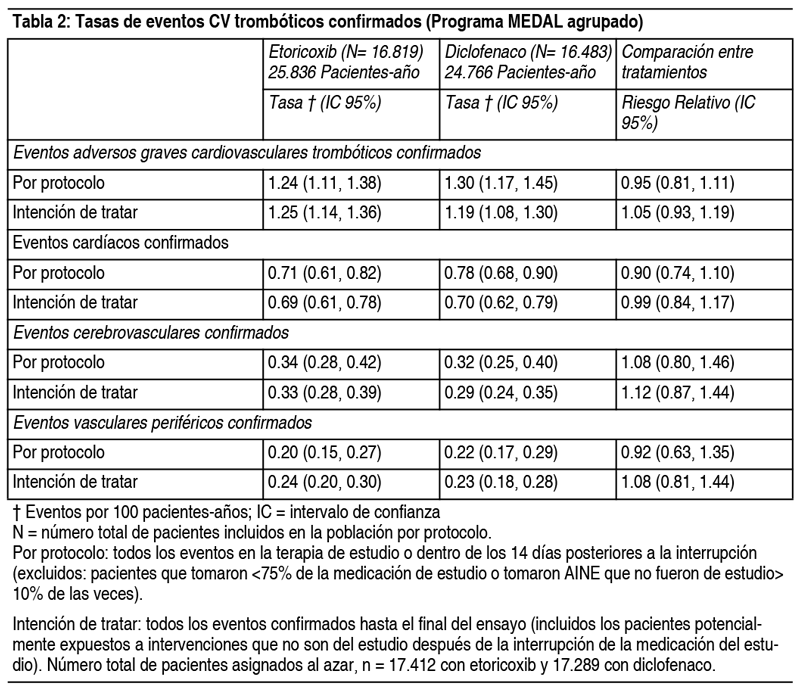 Propiedades:Propiedades farmacodinámicas: Mecanismo de acción: Etoricoxib es un inhibidor oral selectivo de la ciclooxigenasa 2 (COX-2) dentro del rango de dosis clínica. En todos los estudios de farmacología clínica, etoricoxib produjo una inhibición dependiente de la dosis de COX-2 sin inhibición de la COX-1 en dosis de hasta 150 mg al día. Etoricoxib no inhibió la síntesis de prostaglandinas gástricas y no tuvo efecto sobre la función plaquetaria. La ciclooxigenasa es responsable de la generación de prostaglandinas. Se han identificado 2 isoformas, COX-1 y COX-2. La COX-2 es la isoforma de la enzima que se ha demostrado que es inducida por estímulos proinflamatorios y se ha postulado que es la principal responsable de la síntesis de los mediadores prostanoides del dolor, la inflamación y la fiebre. La COX-2 también está involucrada en la ovulación, la implantación y el cierre del ductus arterioso, la regulación de la función renal y las funciones del sistema nervioso central (inducción de la fiebre, percepción del dolor y función cognitiva). También puede desempeñar un papel en la curación de la úlcera. La COX-2 ha sido identificada en el tejido alrededor de las úlceras gástricas en el hombre, pero su relevancia para la curación de la úlcera no ha sido establecida. Eficacia clínica y seguridad: Eficacia: En pacientes con osteoartritis (OA), etoricoxib 60 mg 1 vez al día proporcionó mejoras significativas en el dolor y las evaluaciones de los pacientes sobre el estado de la enfermedad. Estos efectos beneficiosos se observaron tan pronto como el segundo día de terapia y se mantuvieron durante hasta 52 semanas. Los estudios con etoricoxib 30 mg 1 vez al día demostraron una eficacia superior al placebo durante un período de tratamiento de 12 semanas (utilizando evaluaciones similares a las de los estudios anteriores). En un estudio de rango de dosis, etoricoxib 60 mg demostró una mejoría significativamente mayor que 30 mg para los 3 puntos finales primarios durante las 6 semanas de tratamiento. La dosis de 30 mg no se ha estudiado en la osteoartritis de manos. En pacientes con artritis reumatoide (AR), etoricoxib 90 mg 1 vez al día proporcionó mejoras significativas en el dolor, la inflamación y la movilidad. Estos efectos beneficiosos se mantuvieron durante los períodos de tratamiento de 12 semanas. En pacientes que sufren ataques de artritis gotosa aguda, etoricoxib 120 mg 1 vez al día durante un período de tratamiento de 8 días, alivió el dolor y la inflamación moderados a extremos de las articulaciones, comparables a la indometacina 50 mg 3 veces al día. Se observó alivio del dolor tan pronto como 4 horas después del inicio del tratamiento. En pacientes con espondilitis anquilosante, etoricoxib 90 mg 1 vez al día proporcionó mejoras significativas en el dolor, la inflamación, la rigidez y la función de la columna vertebral. El beneficio clínico de etoricoxib se observó tan pronto como el segundo día de tratamiento después del inicio del tratamiento y se mantuvo durante todo el período de tratamiento de 52 semanas. Seguridad: Programa multinacional Etoricoxib and Diclofenac Arthritis Long-term (MEDAL): El Programa MEDAL fue un Programa de Resultados de Seguridad Cardiovascular (CV) diseñado prospectivamente, de datos agrupados de 3 ensayos aleatorizados, comparativos, doble ciego y controlados, el estudio MEDAL, EDGE II y EDGE. Seguridad general: No hubo diferencias significativas entre etoricoxib y diclofenaco en la tasa de eventos trombóticos cardiovasculares. Los eventos adversos cardio-renales se observaron con mayor frecuencia con etoricoxib que con diclofenaco, y este efecto fue dosis-dependiente (ver resultados específicos a continuación). Los eventos adversos gastrointestinales y hepáticos se observaron significativamente más frecuentemente con diclofenaco que con etoricoxib. La incidencia de experiencias adversas en EDGE y EDGE II y de experiencias adversas consideradas serias o que dieron lugar a la interrupción en el estudio MEDAL fue mayor con etoricoxib que con diclofenaco. Resultados de seguridad cardiovascular: La tasa de eventos adversos graves cardiovasculares trombóticos confirmados (consistentes en eventos vasculares cardíacos, cerebrovasculares y periféricos) fue comparable entre etoricoxib y diclofenaco, y los datos se resumen en la tabla a continuación. No hubo diferencias estadísticamente significativas en las tasas de eventos trombóticos entre el etoricoxib y el diclofenaco en todos los subgrupos analizados, incluidas las categorías de pacientes en un rango de riesgo cardiovascular inicial. Cuando se consideran por separado, los riesgos relativos para los eventos cardiovasculares graves trombóticos confirmados con etoricoxib 60 mg o 90 mg en comparación con diclofenaco 150 mg fueron similares.