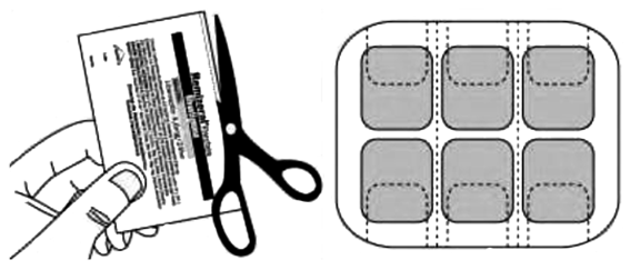 Antes de aplicar un parche, hay que asegurarse que la piel esté limpia, seca y sin pelo, sin polvos, aceite, hidratante o loción que impidan que el parche se pegue bien a la piel, sin cortes, enrojecimientos o irritaciones. Quitar uno de los parches de la plancha, sin tocar con los dedos el lado adhesivo del parche, tomándolo del lado del parche que queda con la lámina plástica adherida. Y vuelva a guardar la plancha con los parches restantes en el sobre, hasta su nuevo uso.