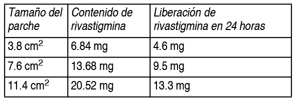 Propiedades:Mecanismo de acción: Aunque se desconoce el mecanismo de acción preciso de rivastigmina, se cree que ejerce su efecto terapéutico al mejorar la función colinérgica. Esto se logra aumentando la concentración de acetilcolina a través de la inhibición reversible de su hidrólisis por la enzima colinesterasa. El efecto de rivastigmina puede disminuir a medida que avanza el proceso de la enfermedad y menos neuronas colinérgicas permanecen funcionalmente intactas. No hay evidencia de que rivastigmina altere el curso del proceso de demencia subyacente. Farmacodinamia: Después de una dosis oral de rivastigmina de 6 mg en humanos, la actividad anticolinesterasa está presente en el líquido cefalorraquídeo durante aproximadamente 10 horas, con una inhibición máxima de aproximadamente el 60 %, 5 horas después de la administración. Los estudios in vitro e in vivo demuestran que la inhibición de la colinesterasa por rivastigmina no se ve afectada por la administración concomitante de memantina, un antagonista del receptor de N-metil-D-aspartato. Farmacocinética: Absorción: Después de la aplicación inicial del parche de rivastigmina, existe un tiempo de retraso de 0.5 a 1 hora en su absorción. Las concentraciones luego aumentan lentamente, generalmente alcanzando un máximo después de 8 horas, aunque los valores máximos (Cmáx) también pueden ocurrir más tarde (de 10 a 16 horas). Después del pico, las concentraciones plasmáticas disminuyen lentamente durante el resto del período de aplicación de 24 horas. En estado estacionario, los niveles mínimos son aproximadamente del 60 % al 80 % de los niveles máximos. Un parche de 9.5 mg/24 horas da una exposición aproximadamente igual a la proporcionada por una dosis oral de 6 mg, 2 veces al día (es decir, 12 mg/día). La variabilidad interindividual en la exposición es menor (43 % a 49 %) para la formulación transdérmica, en comparación con las formulaciones orales (73 % a 103 %). La fluctuación (entre la Cmáx y la Cmín) es menor para los parches que para la formulación oral de rivastigmina. Durante una aplicación dérmica de 24 horas, aproximadamente el 50 % del contenido de fármaco del parche se libera del sistema. El área de exposición bajo la curva de concentración plasmática desde el tiempo cero hasta el infinito (AUC0-∞) de rivastigmina (y el metabolito NAP266-90) es mayor cuando el parche se aplica en la parte superior de la espalda, el pecho o la parte superior del brazo. Se podrían usar otros 2 sitios (abdomen y muslo) si ninguno de los otros 3 sitios está disponible, pero el profesional debe saber que la exposición a rivastigmina en plasma asociada con estos sitios es aproximadamente de un 20 % a un 30 % menor. No hubo acumulación relevante de rivastigmina o del metabolito NAP226-90 en plasma en pacientes con enfermedad de Alzheimer con dosis diarias. El perfil farmacocinético de los parches transdérmicos de rivastigmina es comparable en pacientes con enfermedad de Alzheimer y en pacientes con demencia asociada a la enfermedad de Parkinson. Distribución: Rivastigmina se une débilmente a las proteínas plasmáticas (aproximadamente el 40 %) en el rango terapéutico. Atraviesa fácilmente la barrera hematoencefálica, alcanzando concentraciones máximas en el LCR en 1.4 a 2.6 horas. El rango del volumen aparente de distribución es de 1.8 a 2.7 l/kg. Metabolismo: Rivastigmina se metaboliza en gran medida principalmente a través de la hidrólisis mediada por colinesterasas en el metabolito descarbamilado NAP226-90. In vitro, este metabolito muestra una inhibición mínima de la acetilcolinesterasa (menos del 10 %). Basado en la evidencia de estudios in vitro y en animales, las principales isoenzimas del citocromo P450 están mínimamente involucradas en el metabolismo de rivastigmina. La proporción de AUC0-∞ entre el metabolito y el fármaco sin metabolizar es aproximadamente 0.7 después de la aplicación del parche versus 3.5 después de la administración oral, lo que indica que se produce mucho menos metabolismo después del tratamiento dérmico. Se forma menos NAP226-90 después de la aplicación del parche, probablemente debido a la falta de metabolismo presistémico (primer paso hepático). Sobre la base de estudios in vitro, no se detectaron rutas metabólicas únicas en la piel humana. Eliminación: La excreción renal de los metabolitos es la principal vía de eliminación. La rivastigmina sin cambios se encuentra en cantidades mínimas en la orina. Después de la administración de 14C-rivastigmina, la eliminación renal es rápida y esencialmente completa (más del 90 %) en 24 horas. Menos del 1 % de la dosis administrada se excreta en las heces. La vida media de eliminación aparente en el plasma es de aproximadamente 3 horas después de la eliminación del parche. El aclaramiento renal es de aproximadamente 2.1 a 2.8 l/h. Peso corporal: La exposición a la rivastigmina es mayor en sujetos con bajo peso corporal. En comparación con un paciente con un peso corporal de 65 kg, las concentraciones de rivastigmina en estado estacionario en un paciente con un peso corporal de 35 kg se duplicarían aproximadamente, mientras que, para un paciente con un peso corporal de 100 kg, las concentraciones se reducirían aproximadamente a la mitad. Insuficiencia hepática: Después de una dosis única de 3 mg, el aclaramiento oral promedio de rivastigmina es 60 % menor en pacientes con insuficiencia hepática que en sujetos sanos. Después de una dosis oral de 6 mg, 2 veces al día, el aclaramiento promedio de rivastigmina· es 65 % más bajo en pacientes con insuficiencia hepática leve (Child-Pugh 5 a 6) y moderada (Child-Pugh 7 a 9) que en sujetos sanos. Tabaquismo: Después de la administración oral de rivastigmina (hasta 12 mg/día) junto con nicotina, el análisis farmacocinético poblacional mostró un aumento del aclaramiento oral de rivastigmina en un 23 %.