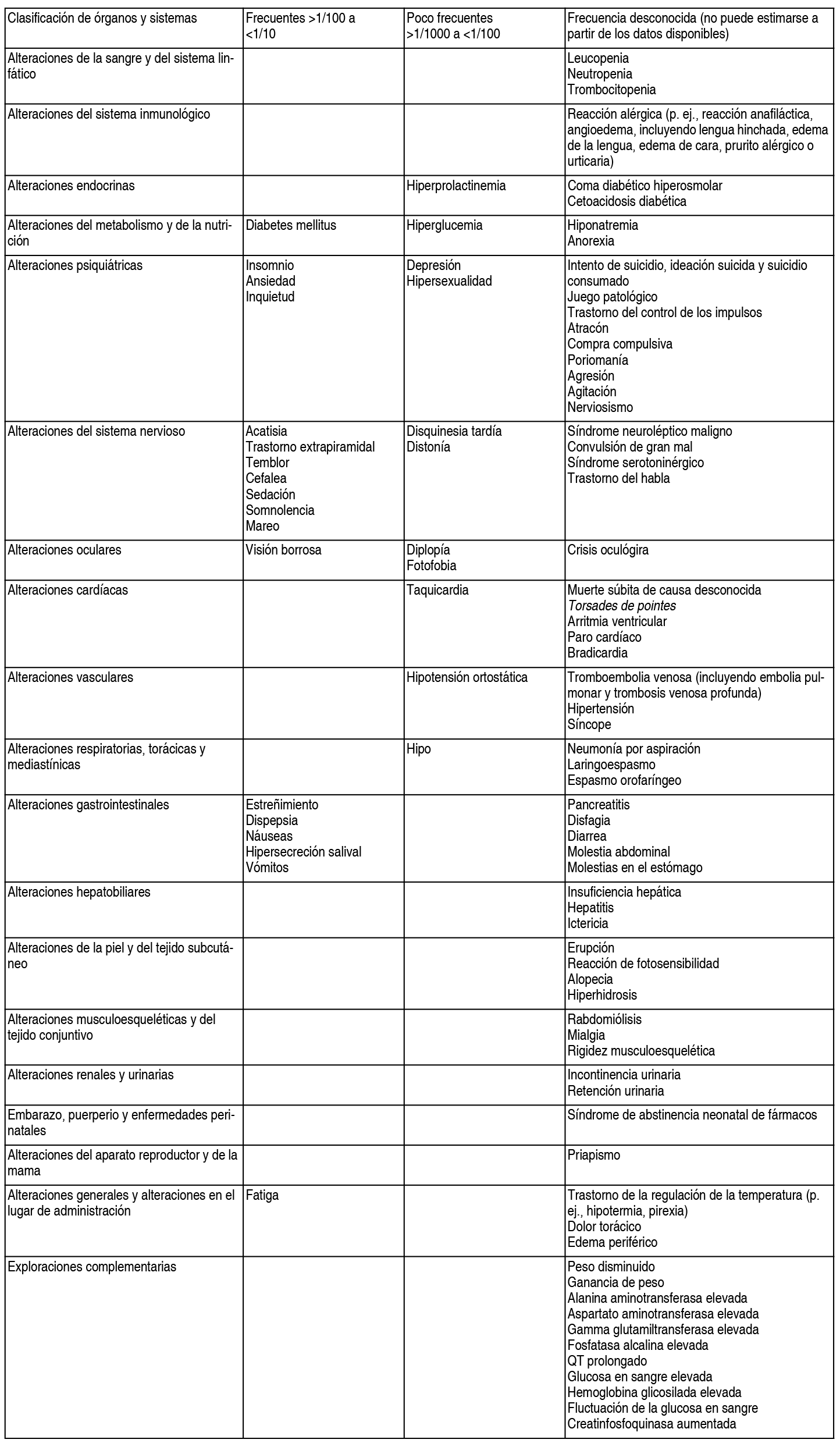 Efectos Colaterales: A continuación, se puede apreciar un cuadro con las reacciones adversas clasificadas en orden de frecuencia MedDRA y por clase de sistema de órganos. Se usaron los siguientes grupos de frecuencia: muy frecuentes (1/10), frecuentes (1/100 a <1/10), poco frecuentes (1/1000 a <1/100), raras (1/10 000 a <1/1000), muy raras (<1/10 000), frecuencia desconocida (no puede ser estimado a partir de los datos disponibles).