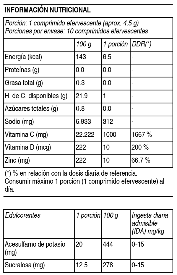 Composición: Contiene: Ácido Ascórbico (vitamina C), Bicarbonato de Sodio, Ácido Cítrico Anhidro, Isomaltitol, Ácido Málico, Betacaroteno 1 %, Carbonato de Sodio Anhidro, Esencia de Naranja, Citrato de Zinc (zinc), Cloruro de Sodio, Acesulfame Potásico, Sucralosa, Colecalciferol (vitamina D).