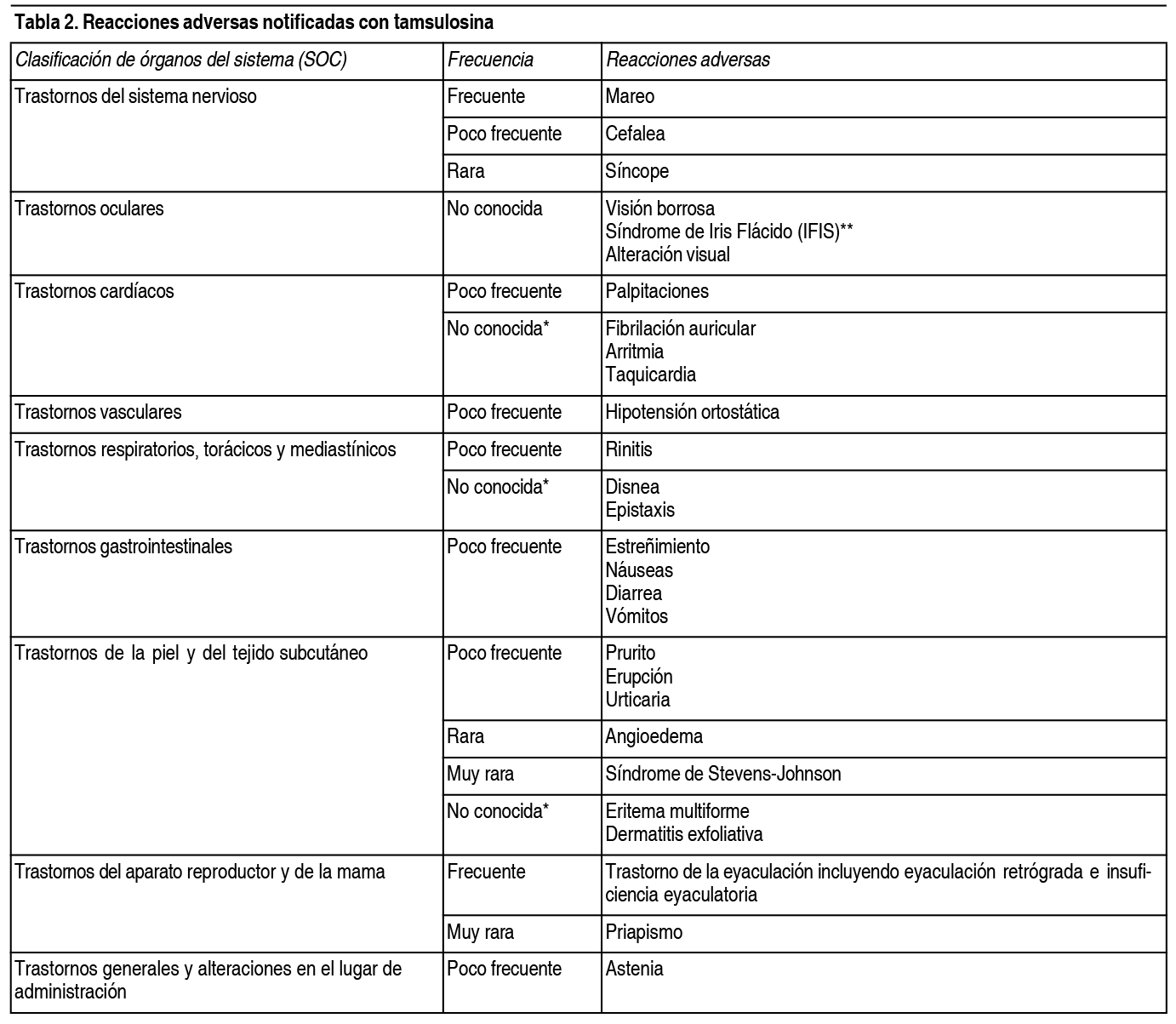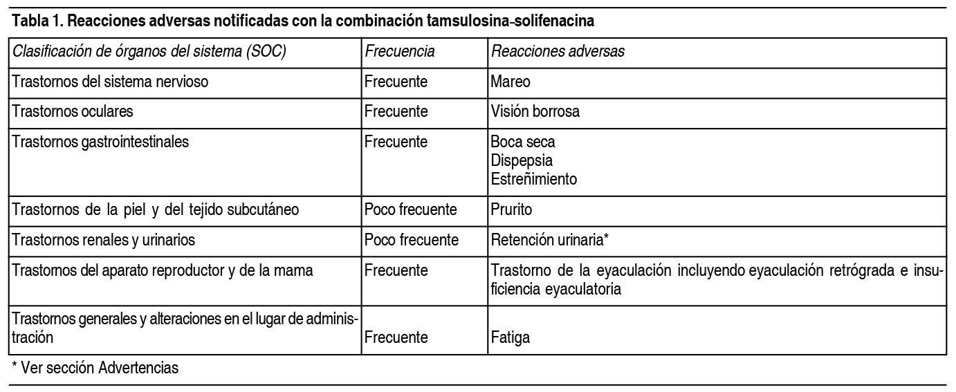 Efectos Colaterales:Resumen del perfil de seguridad: La combinación tamsulosina-solifenacina puede provocar reacciones adversas anticolinérgicas, en general, de gravedad leve a moderada. Las reacciones adversas más frecuentemente notificadas durante los estudios clínicos realizados durante el desarrollo de tamsulosina-solifenacina fueron sequedad de boca (9.5 %), seguida de estreñimiento (3.2 %) y dispepsia (incluyendo dolor abdominal; 2.4 %). Otras reacciones adversas frecuentes son mareos (incluyendo vértigo; 1.4 %), visión borrosa (1.2 %), fatiga (1.2 %) y trastorno de la eyaculación (incluyendo eyaculación retrógrada; 1.5 %). La retención urinaria aguda (0.3 %, poco frecuente) es la reacción adversa al medicamento más grave que se ha observado durante el tratamiento con tamsulosina-solifenacina en estudios clínicos. Lista tabulada de reacciones adversas: En la Tabla 1, se reflejan las reacciones adversas al medicamento que se han observado durante los estudios clínicos doble ciego realizados durante el desarrollo de tamsulosina-solifenacina (basándose en los informes de acontecimientos adversos relacionados con el tratamiento, que han sido notificados al menos por 2 pacientes y que ocurrieron con una frecuencia superior que en el tratamiento con placebo en los estudios doble ciego). En las tablas 2 y 3, se reflejan las reacciones adversas al medicamento (RAM) previamente notificadas con uno de los componentes individuales (presentados en las informaciones para prescribir de tamsulosina 0.4 mg y solifenacina 5 y 10 mg, respectivamente) que también pueden ocurrir cuando se toma tamsulosina-solifenacina (algunas de ellas no se han observado durante el programa de desarrollo clínico de tamsulosina-solifenacina). La frecuencia de las reacciones adversas se define como: Muy frecuentes (≥1/10), frecuentes (≥1/100 a <1/10), poco frecuentes (≥1/1000 a <1/100), raras (≥1/10 000 a <1/1000), muy raras (<1/10 000), frecuencia no conocida (no puede estimarse a partir de los datos disponibles).