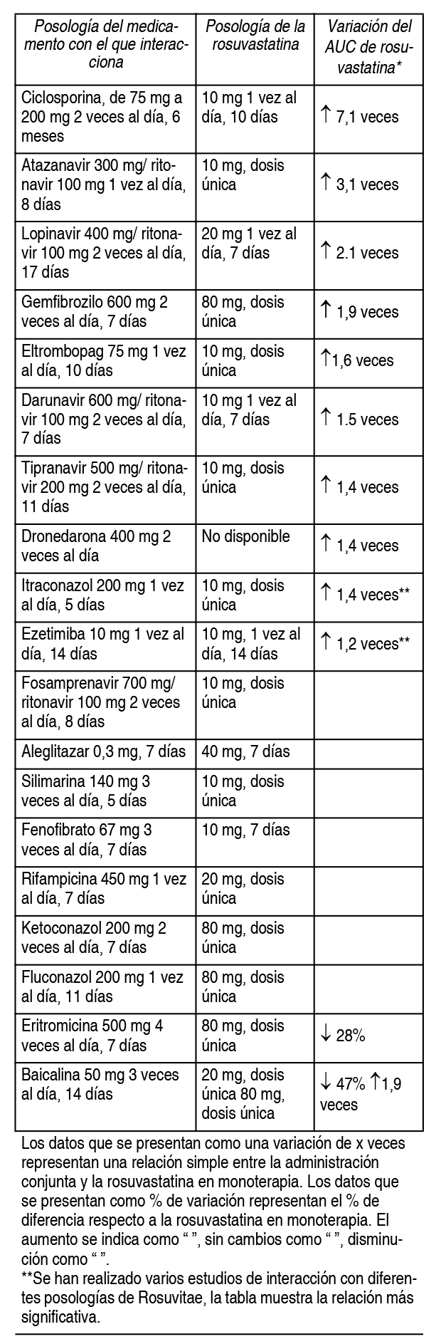 Interacciones Medicamentosas:Efectos de los medicamentos administrados conjuntamente con Rosuvitae®: Inhibidores de proteínas transportadoras: la rosuvastatina es sustrato de ciertas proteínas transportadoras, incluyendo el transportador de captación hepática OATP1B1 y el transportador de eflujo BCRP. La administración concomitante de Rosuvitae® con inhibidores de estas proteínas transportadoras puede provocar un aumento de las concentraciones plasmáticas de rosuvastatina y aumentar el riesgo de miopatía. Ciclosporina: Los valores de AUC de rosuvastatina durante el tratamiento concomitante con Rosuvitae® y ciclosporina fueron, como media, 7 veces superiores a los observados en individuos sanos. Esta administración concomitante no afectó a las concentraciones plasmáticas de la ciclosporina. Inhibidores de la proteasa: Pese a que se desconoce el mecanismo exacto de interacción, el uso concomitante de los inhibidores de la proteasa puede aumentar de manera importante la exposición a la rosuvastatina. En 1 estudio farmacocinético, la administración concomitante de 10 mg de rosuvastatina y un medicamento compuesto por la combinación de 2 inhibidores de la proteasa en individuos sanos se asoció con un aumento aproximadamente de 3 y 7 veces respectivamente en el AUC y la Cmax. Gemfibrozilo y otros medicamentos reductores del colesterol: la administración concomitante de gemfibrozilo y Rosuvitae® duplicó la Cmax y el AUC de la rosuvastatina. De acuerdo con los resultados de los estudios de interacción específica, no se espera ninguna interacción farmacocinética significativa con el fenofibrato, aunque sí podría darse una interacción farmacodinámica. El gemfibrozilo, fenofibrato, otros fibratos y dosis hipolipemiantes (mayores o iguales a 1g/día) de niacina, aumentan el riesgo de miopatía cuando se administran concomitantemente con inhibidores de la HMG-CoA reductasa. La dosis de 40 mg está contraindicada con el uso concomitante de fibratos. Estos pacientes deberán iniciar también el tratamiento con una dosis de 5 mg. Ezetimiba: el uso concomitante de Rosuvitae® 10 mg de ezetimiba provocó un aumento de 1.2 veces en el AUC de rosuvastatina en sujetos hipercolesterolémicos. Sin embargo, no puede descartarse una interacción farmacodinámica en términos de reacciones adversas entre ambos. Antiácidos: la administración concomitante de Rosuvitae® con una suspensión antiácida a base de hidróxido de aluminio y magnesio, la concentración plasmática de rosuvastatina se reduce un 50% aproximadamente. El efecto se ve mitigado si se administra el antiácido 2 horas después de la administración de la estatina. No se ha determinado la importancia clínica de esta interacción. Eritromicina: el uso concomitante de Rosuvitae® y eritromicina originó una disminución del 20% del AUC y una disminución del 30% de la Cmax de la rosuvastatina. Esta interacción puede deberse a un aumento de la motilidad intestinal causada por la eritromicina. Enzimas del citocromo P450: estudios tanto in vitro e in vivo muestran que la rosuvastatina no inhibe ni induce las isoenzimas del citocromo P450. No se esperan interacciones medicamentosas debidas al metabolismo mediado por el citocromo P450. No se han observado interacciones clínicamente relevantes entre la rosuvastatina y fluconazol (inhibidor CYP2C9 y CYP3A4) ni el ketoconazol (inhibidor de CYP2A6 y CYP3A4). Interacciones que precisan ajustes posológicos de la rosuvastatina: Cuando al paciente se le administre Rosuvitae® conjuntamente con otros medicamentos conocidos por aumentar la exposición a la rosuvastatina, debe ajustarse de la dosis de Rosuvitae®. Se empezará con 1 dosis de 5 mg de Rosuvitae® una vez al día si se espera que el AUC sea el doble o más. La dosis máxima diaria de Rosuvitae® se ajustará de modo que no sea probable que la exposición prevista a la rosuvastatina sea mayor que la de una dosis diaria de 40 mg tomada sin medicamentos que interaccionen.