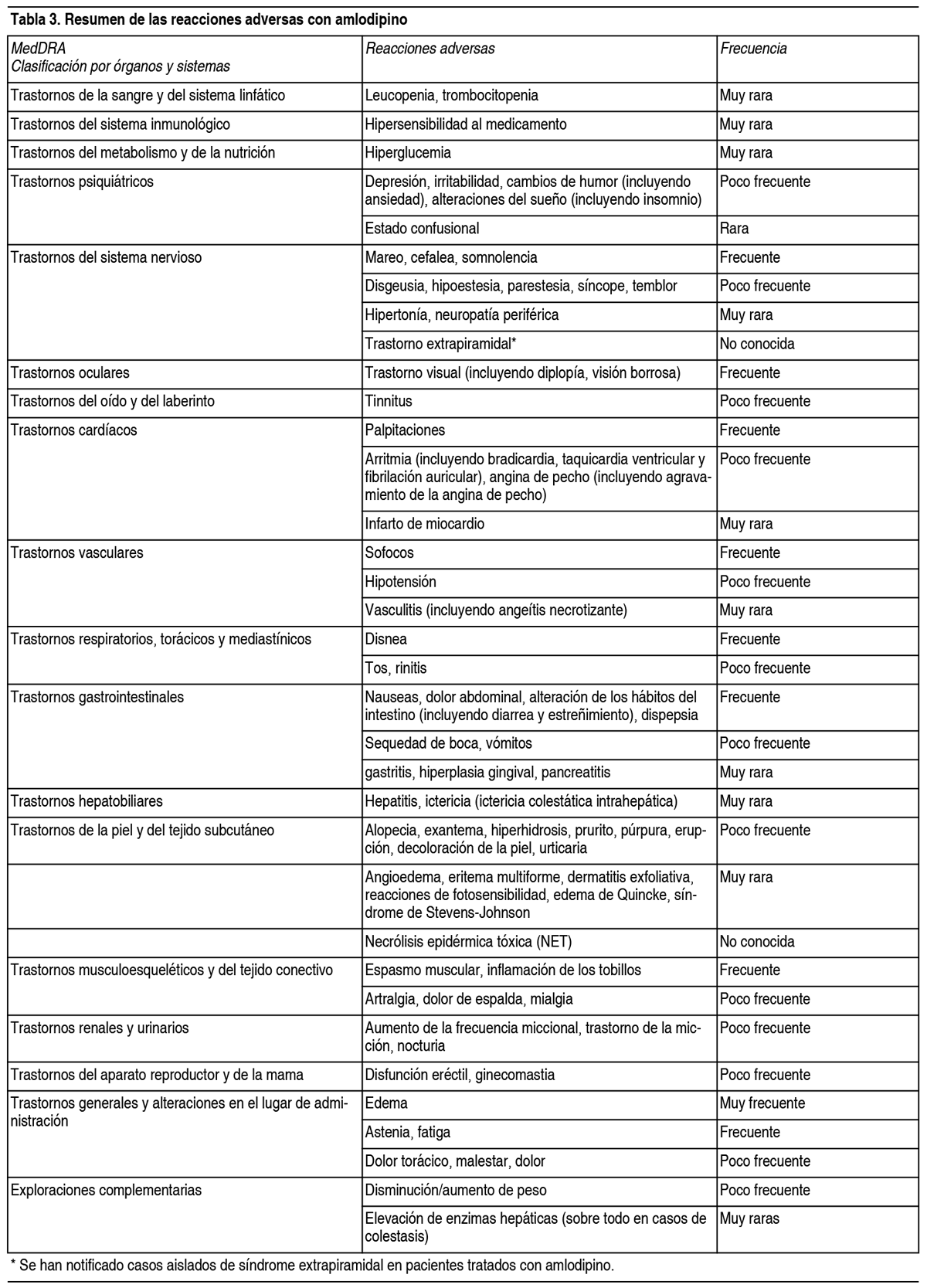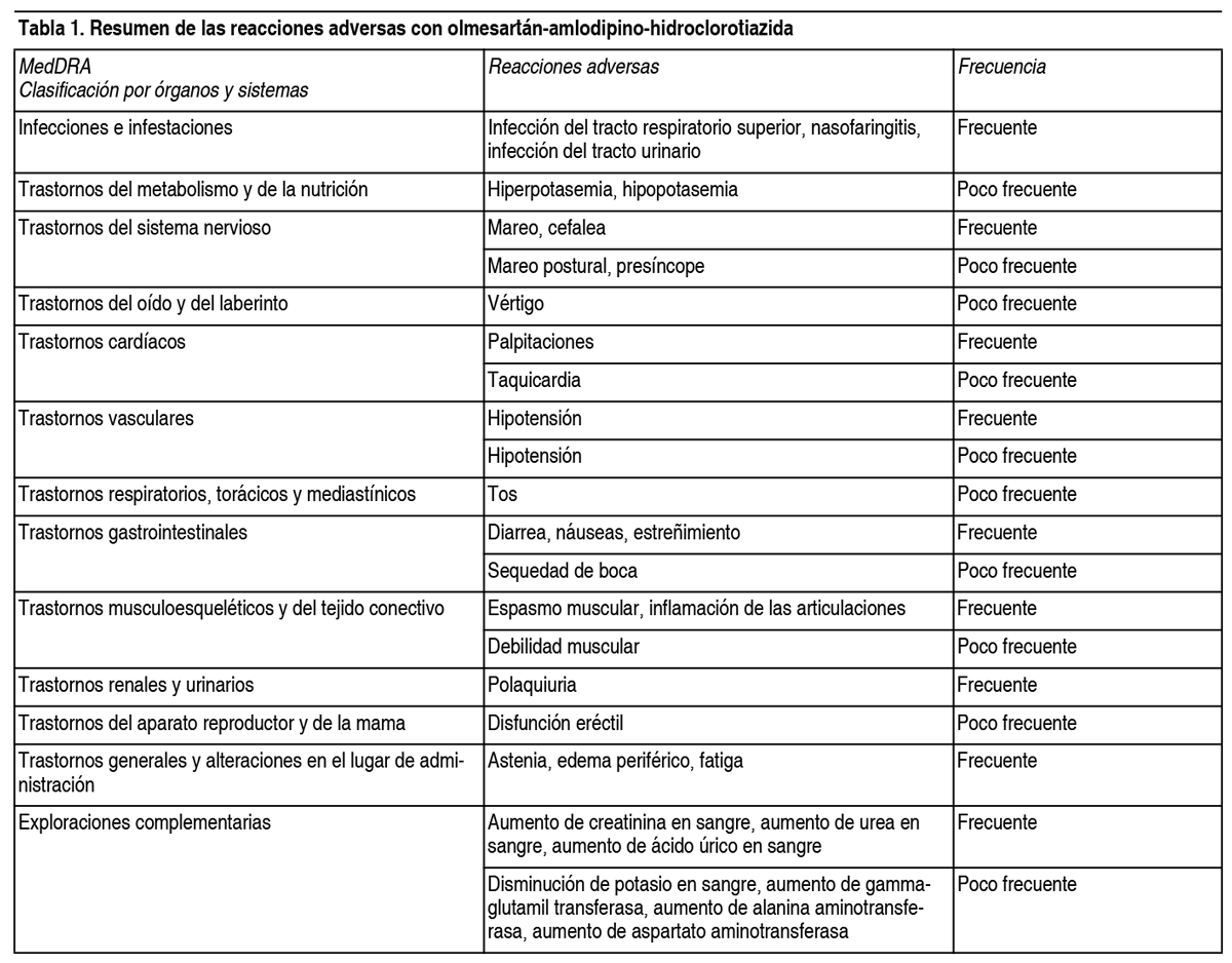 Efectos Colaterales: En las Tablas 1, 2, 3 y 4 se resumen las reacciones adversas procedentes de los ensayos clínicos publicados, de los estudios de seguridad posteriores a la autorización y de las notificaciones espontáneas para la combinación de olmesartán-amlodipino-hidroclorotiazida, así como para los componentes individuales olmesartán medoxomilo, amlodipino e hidroclorotiazida, con base en el perfil de seguridad conocido de los componentes individuales. Las reacciones adversas notificadas más frecuentemente durante el tratamiento con olmesartán-amlodipino-hidroclorotiazida son edema periférico, cefalea y mareo. Se ha utilizado la terminología siguiente para clasificar la aparición de las reacciones adversas: Muy frecuentes (≥1/10), frecuentes (≥1/100 a <1/10), poco frecuentes (≥1/1000 a <1/100), raras (≥1/10 000 a <1/1000), muy raras (<1/10 000) y frecuencia no conocida (no puede estimarse a partir de los datos disponibles).