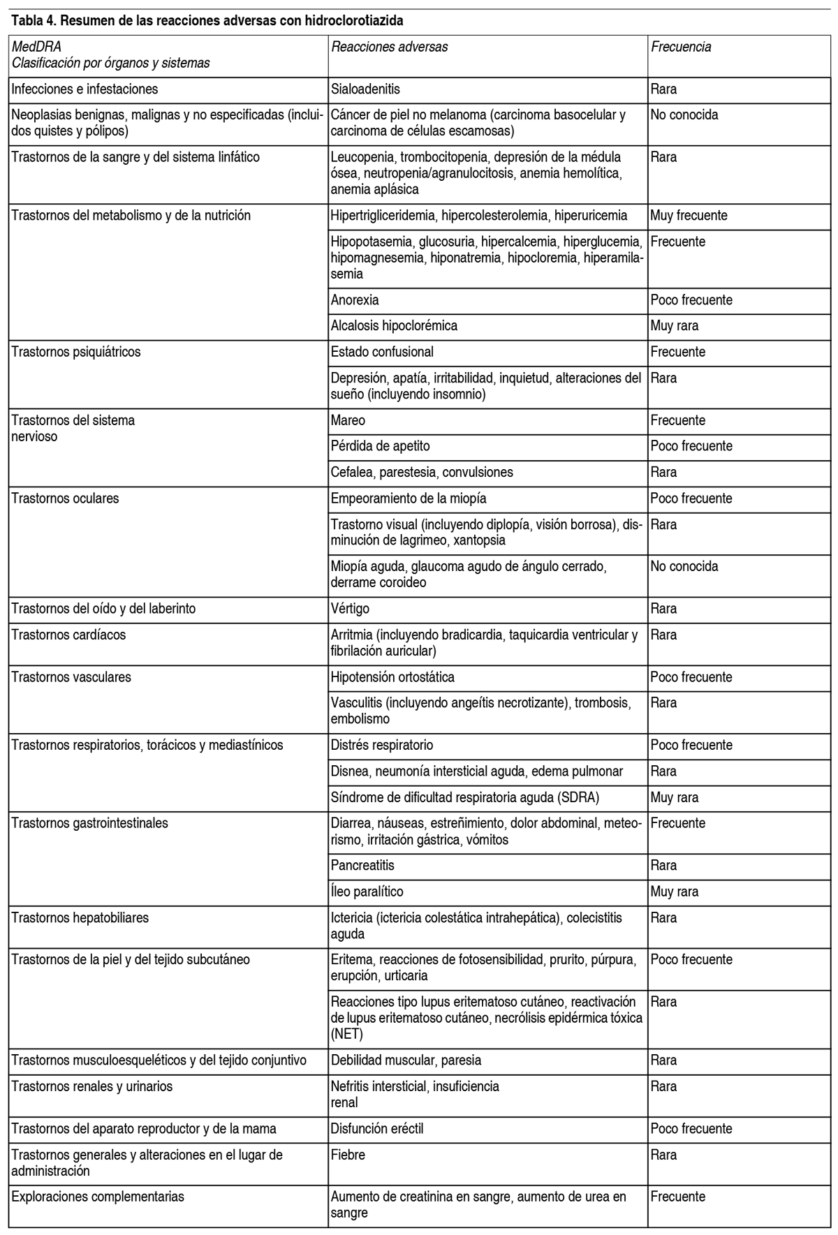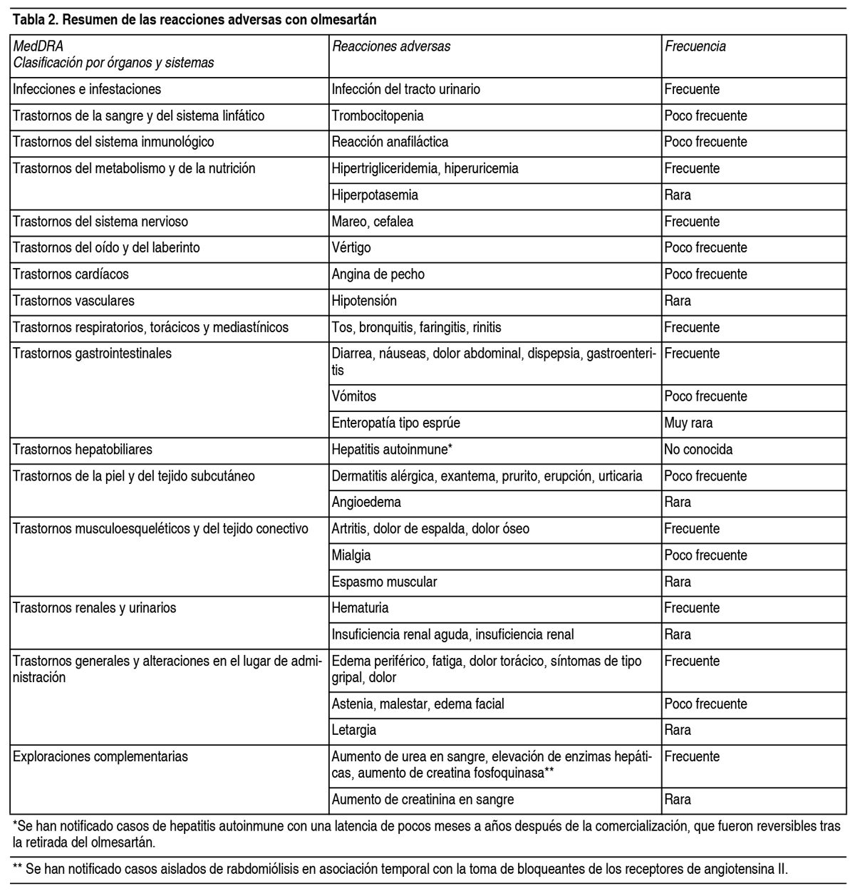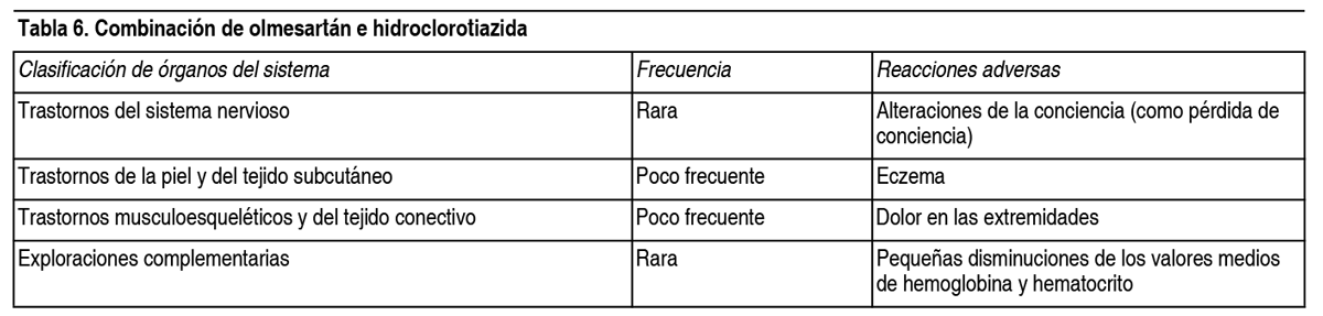 Otras reacciones adversas notificadas en los ensayos clínicos o a partir de la experiencia posterior a la comercialización con una combinación a dosis fija de olmesartán e hidroclorotiazida y no notificadas para olmesartán-amlodipino-hidroclorotiazida, olmesartán en monoterapia o hidroclorotiazida en monoterapia o notificadas con mayor frecuencia con la combinación doble (Tabla 6):