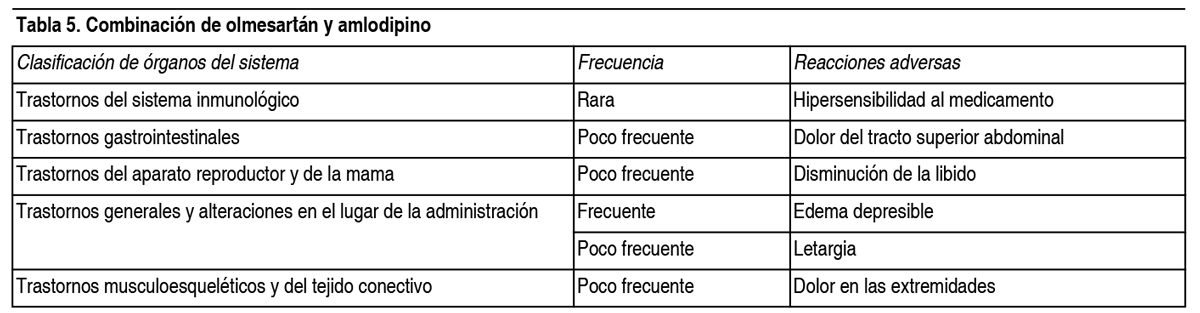 Cáncer de piel no melanoma: Con base en los datos disponibles de estudios epidemiológicos, se ha observado una asociación dependiente de la dosis acumulada entre HCTZ y el CPNM. Otras reacciones adversas notificadas en los ensayos clínicos o a partir de la experiencia posterior a la comercialización con una combinación a dosis fija de olmesartán y amlodipino y no notificadas para olmesartán-amlodipino-hidroclorotiazida, olmesartán en monoterapia o amlodipino en monoterapia o notificadas con mayor frecuencia con la combinación doble (Tabla 5):