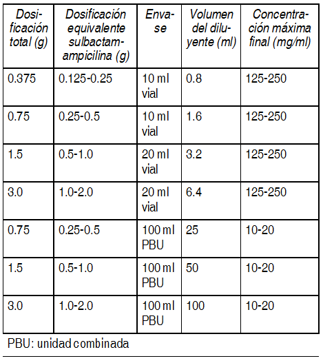 Posología: El sulbactam sódico/ampicilina sódica I.M./I.V. puede administrarse ya sea utilizando la vía intramuscular o intravenosa. Se pueden utilizar las siguientes diluciones: