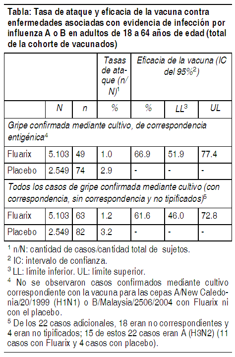 Propiedades:Farmacodinamia: Fluarix induce anticuerpos humorales contra las hemaglutininas. Estos anticuerpos neutralizan los virus influenza. Un título de inhibición de hemaglutinina igual o superior a 1:40 en el suero sanguíneo se considera protector. Por lo general, se obtiene seroprotección a las 2-3 semanas. La duración inmunitaria tras la vacunación a cepas homólogas o cepas estrechamente relacionadas a las cepas de la vacuna varía, aunque suele ser entre 6-12 meses. Fluarix ofrece protección durante la temporada actual de la influenza. Se han evaluado los índices de seroconversión para la temporada de vacunación antiinfluenza 2012-2013 con la cepa tipo A/California/7/2009 (H1N1) pdm09 [variante A/Christchurch/16/2010 (NIB-74xp)], A/Victoria/361/2011 (H3N2) [variante A/Victoria/361/2011 (IVR-165)], B/Wisconsin/1/2010 [variante B/Hubei-Wujiagang/158/2009 (NYMC BX-39)]. Los índices de protección tras la vacunación superaron los requisitos de los criterios del Comité Europeo de Medicamentos de Uso Humano (CHMP) para las vacunas anti-influenza (> 70% para adultos de 18 - 60 años y > 60% para adultos mayores de 60 años). En un estudio clínico realizado en más de 7.600 sujetos de la República Checa y de Finlandia, se evaluó la eficacia de Fluarix en la prevención de casos de gripe A y/o B confirmados mediante cultivo para cepas de correspondencia antigénica con la vacuna. Se realizó un monitoreo de los sujetos para detectar enfermedades similares a la influenza confirmada mediante cultivo de influenza (consulte los resultados en la tabla que figura a continuación). Se definió la enfermedad similar a la influenza como la aparición de al menos un síntoma general (fiebre ≥37.8ºC y/o mialgia) y al menos un síntoma respiratorio (tos y/o dolor de garganta).