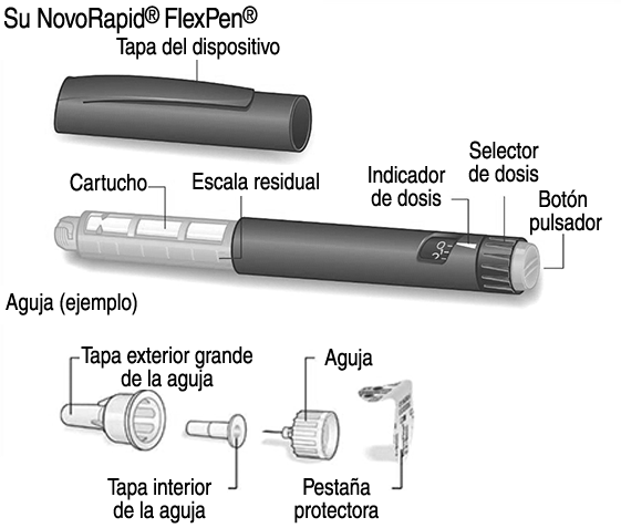 Modo de Empleo:Precauciones especiales para desecho y otras manipulaciones: No se deben compartir las agujas de NovoRapid®, FlexPen®. No se debe rellenar el cartucho. No se debe utilizar NovoRapid® si no se ve transparente e incoloro o si fue congelado. Se debe advertir al paciente sobre la necesidad de descartar la aguja después de cada inyección. NovoRapid® puede utilizarse en un sistema de bomba para infusión (ISCI), tal como se describe en la sección Método de administración. Se evaluaron los tubos cuyos materiales de la superficie interna están fabricados con polietileno o poliolefina y se halló que son compatibles con el uso de la bomba. En caso de emergencia para quienes estén utilizando NovoRapid® actualmente (hospitalización o funcionamiento incorrecto del dispositivo de insulina), NovoRapid® puede extraerse de la FlexPen® con una jeringa para insulina U100. Instrucciones de uso para el paciente: No use NovoRapid®: Si es alérgico (hipersensible) a la insulina asparta o a alguno de los demás ingredientes de NovoRapid®. Si sospecha que está comenzando un episodio de hipoglucemia (bajo nivel de azúcar en sangre). Si FlexPen®se cae, se daña o se rompe. Si no ha sido conservado correctamente o si fue congelado. Si la insulina no tiene un aspecto transparente e incoloro. Antes de usar NovoRapid®: Controle la etiqueta para asegurarse de que sea el tipo de insulina correcto. Siempre use una aguja nueva en cada inyección para evitar la contaminación. No se deben compartir las agujas ni NovoRapid®FlexPen®. Método de administración: NovoRapid®se inyecta debajo de la piel (por vía subcutánea) o por infusión continua en un sistema de bomba. NovoRapid® también puede ser inyectado directamente en una vena (por vía endovenosa) por un profesional del ámbito de la salud. La insulina nunca debe inyectarse directamente en un músculo (por vía intramuscular). Siempre cambie el sitio de inyección dentro de la misma región para reducir el riesgo de desarrollar endurecimiento o bultos en la piel. Los mejores lugares para inyectarse son: el frente de la cintura (abdomen); la parte superior de los brazos y el frente de los muslos. La insulina actuará más rápidamente si la inyecta en la cintura. Siempre debe medir el nivel de azúcar en sangre en forma regular. Cómo manipular NovoRapid®FlexPen®: Lea minuciosamente las instrucciones para su uso incluidas en NovoRapid® FlexPen®. El dispositivo debe utilizarse como se describe en las Instrucciones para su Uso. NovoRapid®solución para inyección en un dispositivo prellenado FlexPen®, instrucciones de uso para el paciente: Lea las siguientes instrucciones con atención antes de utilizar NovoRapid®FlexPen®. FlexPen® es un dispositivo de insulina para marcar la dosis única. Puede seleccionar dosis de 1 a 60 unidades en incrementos de a 1 unidad. FlexPen® está diseñado para ser utilizado con agujas descartables NovoFine® o NovoTwist® de una longitud de hasta 8 mm. Como medida de precaución, siempre lleve un aplicador de insulina de repuesto en caso de que se pierda o se dañe FlexPen®.