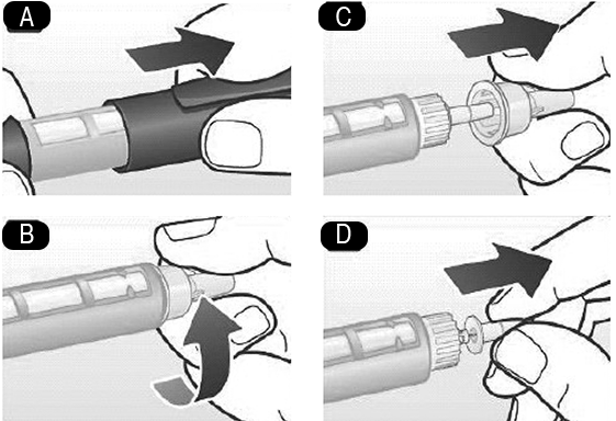 Mantenimiento: FlexPen® está diseñado para funcionar con exactitud y seguridad. Se lo debe manipular con cuidado. Si se cae o si se golpea, existe riesgo de que se dañe y pierda insulina. Puede limpiar el exterior del FlexPen® pasándole un paño medicinal. No sumerja el dispositivo, no lo lave ni lo lubrique ya que podría dañarlo. No rellene el FlexPen®. Preparación de NovoRapid® FlexPen®: Controle la etiqueta para asegurarse de que FlexPen®contenga el tipo de insulina correcto. A. Retire la tapa del dispositivo.