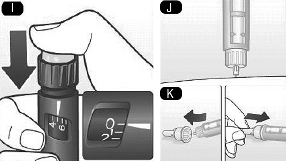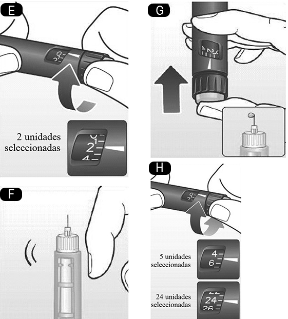 F. Sostenga la FlexPen® con la aguja apuntando hacia arriba y golpee el cartucho suavemente con el dedo varias veces para que suban las burbujas de aire a la parte superior del cartucho. G.Con la aguja hacia arriba, presione el botón pulsador hasta el fondo. El selector de dosis volverá a 0. Deberá aparecer una gota de insulina en la punta de la aguja. En caso contrario, cambie de aguja y repita el procedimiento no más de 6 veces. Si aún así no aparece la gota de insulina, el dispositivo está dañado y debe utilizar uno dispositivo nuevo. Selección de la dosis: Controle que el selector de dosis esté en 0. H. Gire el selector de dosis para seleccionar el número de unidades que desea inyectar. La dosis se puede corregir hacia arriba o hacia abajo girando el selector de dosis en la dirección que corresponda hasta que el indicador marque la dosis correcta. Cuando gire el selector de dosis, tenga cuidado de no presionar el botón pulsador ya que saldría la insulina. No se puede seleccionar una dosis mayor que el número de unidades que quedan en el cartucho. No utilice la escala residual para medir la dosis de insulina. Aplicación de la inyección: Inserte la aguja en la piel. Utilice la técnica de inyección que le indique el médico o la enfermera. I. Inyecte la dosis presionando el botón pulsador hasta el fondo hasta que el indicador marque 0. Tenga cuidado de presionar solamente el botón pulsador al inyectar. El solo hecho de girar el selector de dosis no inyecta la insulina.