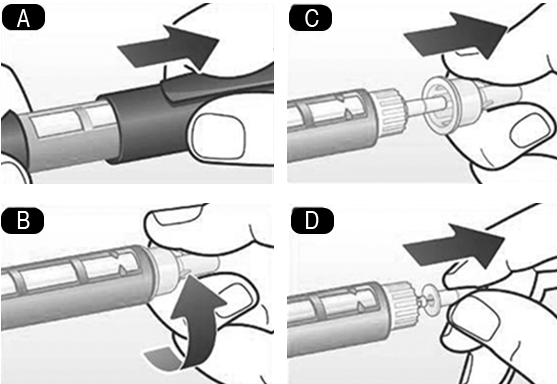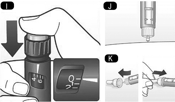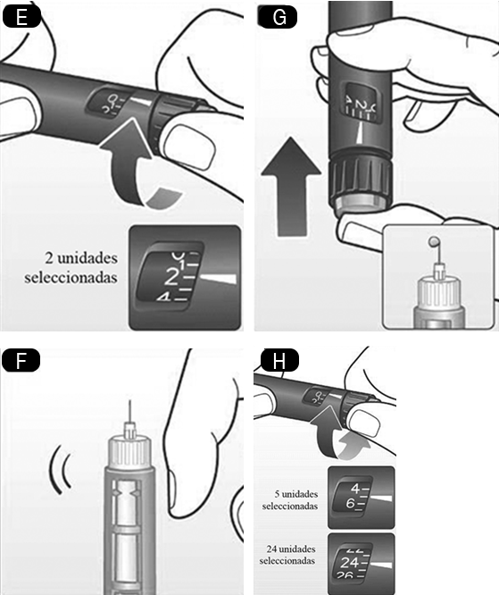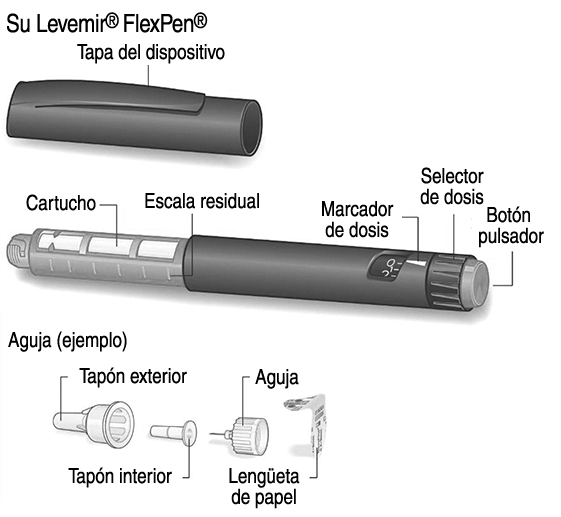 A. Retire la tapa del dispositivo. B. Quite la lengüeta de papel de una aguja desechable nueva. Enrosque recta y firmemente la aguja a su FlexPen®. C. Quite el tapón exterior de la aguja y guárdelo para más tarde. D. Quite el tapón interior de la aguja y deséchelo. Siempre use una aguja nueva para cada inyección, para prevenir la contaminación. Asegúrese de no doblar o dañar la aguja antes de usarla. Para reducir el riesgo de pinchazos inesperados, nunca vuelva a colocar el tapón interior de la aguja después de haberlo retirado. Comprobación del flujo de insulina: Antes de cada inyección, pueden quedar retenidas pequeñas cantidades de aire en el cartucho durante el uso normal. Para evitar inyectar aire y asegurar una dosis correcta: E. Gire el selector de dosis y marque 2 unidades. F. Sostenga su FlexPen® con la punta de la aguja hacia arriba y golpee el dispositivo suavemente con un dedo varias veces para que las burbujas se agrupen en la parte superior del cartucho. G. Manteniendo la aguja hacia arriba, presione totalmente el botón pulsador. El selector de dosis regresa a 0. Una gota de insulina deberá aparecer en la punta de la aguja. Si esto no sucede, cambie la aguja y repita la operación no más de 6 veces. Si la gota de insulina aún no aparece, el dispositivo está defectuoso y deberá utilizar uno nuevo. Selección de su dosis: Verifique que el selector de la dosis marque cero. H. Gire el selector de dosis para seleccionar el número de unidades que usted necesita inyectar. La dosis puede ser corregida para aumentar o reducir la dosis, girando el selector de dosis hacia un lado y hacia el otro hasta que el número de dosis correcta quede alineado con el indicador. Cuando se gira el selector de dosis, debe tenerse cuidado de no presionar el botón pulsador, ya que se perderá insulina. No puede seleccionarse una dosis mayor que el número de unidades restantes en el cartucho. No utilice la escala residual para medir su dosis de insulina. Administración de la inyección: Inserte la aguja bajo su piel. Utilice la técnica de inyección indicada por su médico o enfermera. I. Inyecte la dosis presionando el botón pulsador totalmente hasta que el marcador de dosis quede alineado con el 0. Tenga cuidado de presionar el botón pulsador sólo mientras se inyecta. Si gira el selector de dosis no inyectará la insulina. J. Mantenga el botón pulsador completamente presionado y deje la aguja bajo la piel durante al menos 6 segundos. Esto asegurará que se inyecte la dosis completa. K. Coloque la aguja en el tapón exterior grande de la aguja sin tocarlo. Cuando la aguja esté cubierta, empuje con cuidado el tapón exterior de la aguja completamente y luego desenrosque la aguja. Deseche la aguja con cuidado y coloque nuevamente la tapa del dispositivo. Siempre quite la aguja después de cada inyección y guarde su FlexPen® sin aguja. De lo contrario, el líquido puede fugarse y ocasionar que las dosis no sean adecuadas. Las personas a cargo de pacientes deben tener cuidado cuando manipulen agujas usadas para evitar pinchazos. Deseche con cuidado el FlexPen® usado, sin la aguja. No comparta ni su Levemir® FlexPen® ni las agujas con otra persona.