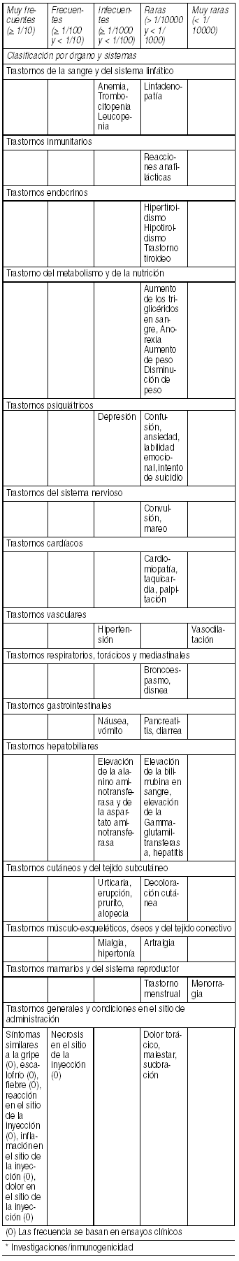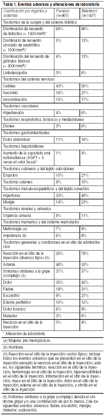Efectos Colaterales: Frecuentemente se ha observado sintomatología de tipo gripal (fiebre, escalofríos, artralgias, malestar, sudoración, cefalea o mialgias). La incidencia de estos síntomas decreció con el tiempo. En general, se recomienda al comienzo del tratamiento realizar una titulación de la dosis con el objeto de aumentar la tolerancia al Betaferon por parte del paciente (véase Posología). La sintomatología de tipo gripal puede reducirse también con la administración de medicamentos antiinflamatorios no esteroides. Tras la administración de Betaferon se observaron frecuentemente reacciones en el lugar de inyección. El tratamiento con 250 microgramos (8 millones de UI) de Betaferon se ha asociado de manera significativa a enrojecimiento, edema, decoloración, inflamación, dolor, hipersensibilidad, necrosis y a reacciones inespecíficas. La incidencia de reacciones en el lugar de la inyección disminuyó habitualmente con el tiempo. La incidencia de reacciones en el lugar de la inyección se puede reducir por medio del empleo de un autoinyector. La siguiente relación de eventos adversos y alteraciones de laboratorio está basada en los ensayos clínicos (tabla 1) y en la fármaco-vigilancia posterior a la comercialización de Betaferon (tabla 2). Es aún limitada la experiencia con Betaferon en pacientes con EM y, consecuentemente, pueden no haberse observado aún los efectos adversos de baja incidencia. Se anota el término MedDRA más apropiado para describir determinada reacción y sus sinónimos o condiciones relacionadas. En la tabla 1 se relacionan los eventos adversos y las alteraciones de laboratorio que se presentaron entre todos los pacientes tratados con 0.25 mg ó 0.16 mg/m2de Betaferon en días alternos por períodos de hasta 3 años en los ensayos clínicos controlados, con una incidencia que era por lo menos 2% mayor que aquella observada en los pacientes que recibieron placebo.