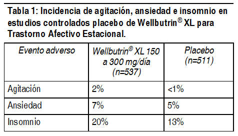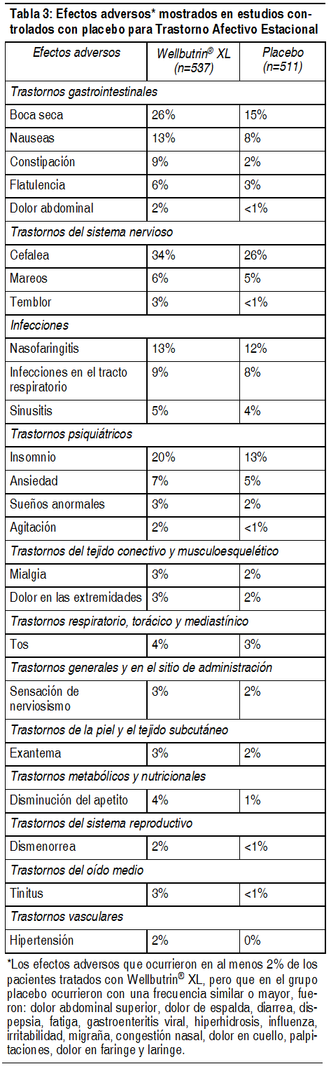 Efectos Colaterales: La siguiente lista proporciona información sobre los efectos adversos, clasificados por sistema corporal, que se identificaron a partir de la experiencia clínica. Generales: Fiebre, dolor torácico, astenia. Cardiovasculares: Taquicardia, palpitaciones, vasodilatación, hipotensión ortostática, elevaciones en la presión arterial (en algunos casos severas), rubefacción, síncope. SNC: Convulsiones (véase Advertencias y Precauciones), insomnio, temblores, distonía, ataxia, parkinsonismo, espasmos, falta de coordinación, trastornos en la concentración, cefalea, mareos, depresión, confusión, delirios, ideación paranoide, alucinaciones, agitación, inquietud, ansiedad, irritabilidad, hostilidad, agresividad, despersonalización, sueños anormales, alteración de la memoria, parestesia. Endocrinos y metabólicos: Anorexia, pérdida de peso, trastornos de la glucemia. Gastrointestinales: Boca seca, trastornos gastrointestinales incluyendo náuseas y vómito, dolor abdominal, estreñimiento. Genitourinarios: Polaquiuria y/o retención urinaria. Hepatobiliares: Elevación de enzimas hepáticas, ictericia, hepatitis. Cutáneos/hipersensibilidad: Exantema, prurito, sudación. Reacciones de hipersensibilidad cuya severidad varía de urticaria a angioedema, disnea/broncoespasmo y, en raras ocasiones, shock anafiláctico. También se han producido comunicaciones de artralgia, mialgia y fiebre, en asociación con exantema y otros síntomas que sugieren una reacción de hipersensibilidad tardía. Es posible que estos síntomas asemejen la enfermedad del suero. En raras ocasiones, también se han comunicado casos de eritema multiforme y síndrome de Stevens-Johnson. Sentidos especiales: Acúfenos, trastornos visuales, trastornos del gusto. Eventos adversos asociados al trastorno afectivo estacional: Efectos adversos que llevaron a la discontinuación del tratamiento: En estudios clínicos, controlados con placebo, el 9% de pacientes tratados con Wellbutrin® XL y el 5% de los pacientes tratados con placebo, discontinuaron el tratamiento debido a los efectos adversos presentados. Los efectos adversos que condujeron a la interrupción del tratamiento en al menos 1% de los pacientes tratados con Wellbutrin® XL, correspondiente a una tasa numéricamente mayor que la del placebo, fueron insomnio (2 % contra < el 1%) y cefalea (1% contra < el 1%). Efectos colaterales que ocurren en una incidencia del 2% o más en pacientes tratados con Wellbutrin®XL: La tabla 3 enumera los efectos adversos inesperados, encontrados en 3 estudios controlados con placebo de pacientes tratados con Wellbutrin® XL durante 6 meses o más. Se incluyeron los efectos ocurridos en una incidencia del 2 % o más y que fueron más frecuentes que en el grupo de placebo. Los efectos colaterales fueron clasificados basándose en el MedDRA.