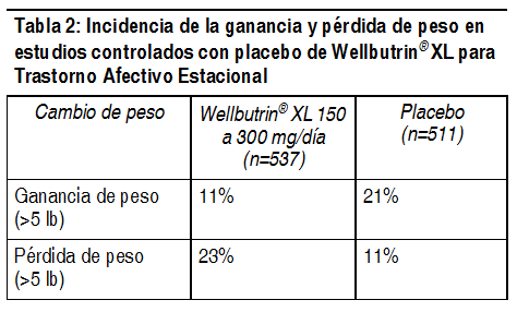 Alteración de peso y apetito: En 3 ensayos clínicos controlados con placebo de trastornos afectivo estacional con Wellbutrin® XL, el porcentaje de pacientes con ganancia o pérdida de peso, se muestran en la Tabla Nº2.
